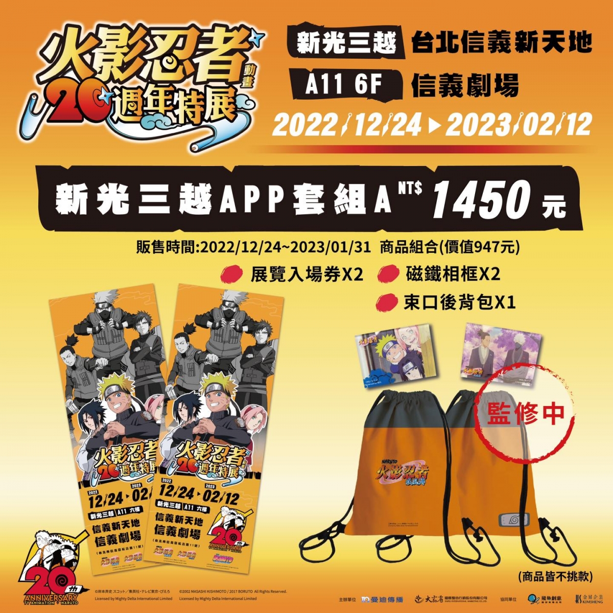 童年回憶殺!火影忍者20周年特展12/24(六)登場,8大場景神還原、全新百款周邊首度販賣!使用新光三越會員點數300點即可兌換入場券、12/24開賣新光三越獨家APP套組,互動沈浸式體驗區讓你一秒變忍者,年末最展覽就在A11 6F信義劇場。