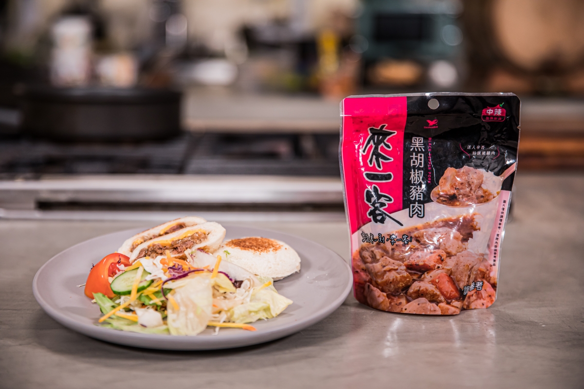 來一客料理包特選珍貴豬腱肉,口感Q彈不油膩,配上鮮磨黑胡椒的香氣,加入起司片,用吐司夾起來稍微烤一下,搭啷!黑胡椒豬肉熱壓吐司就完成啦!連自稱胡椒王的詹姆士都大讚:這真的很好吃!