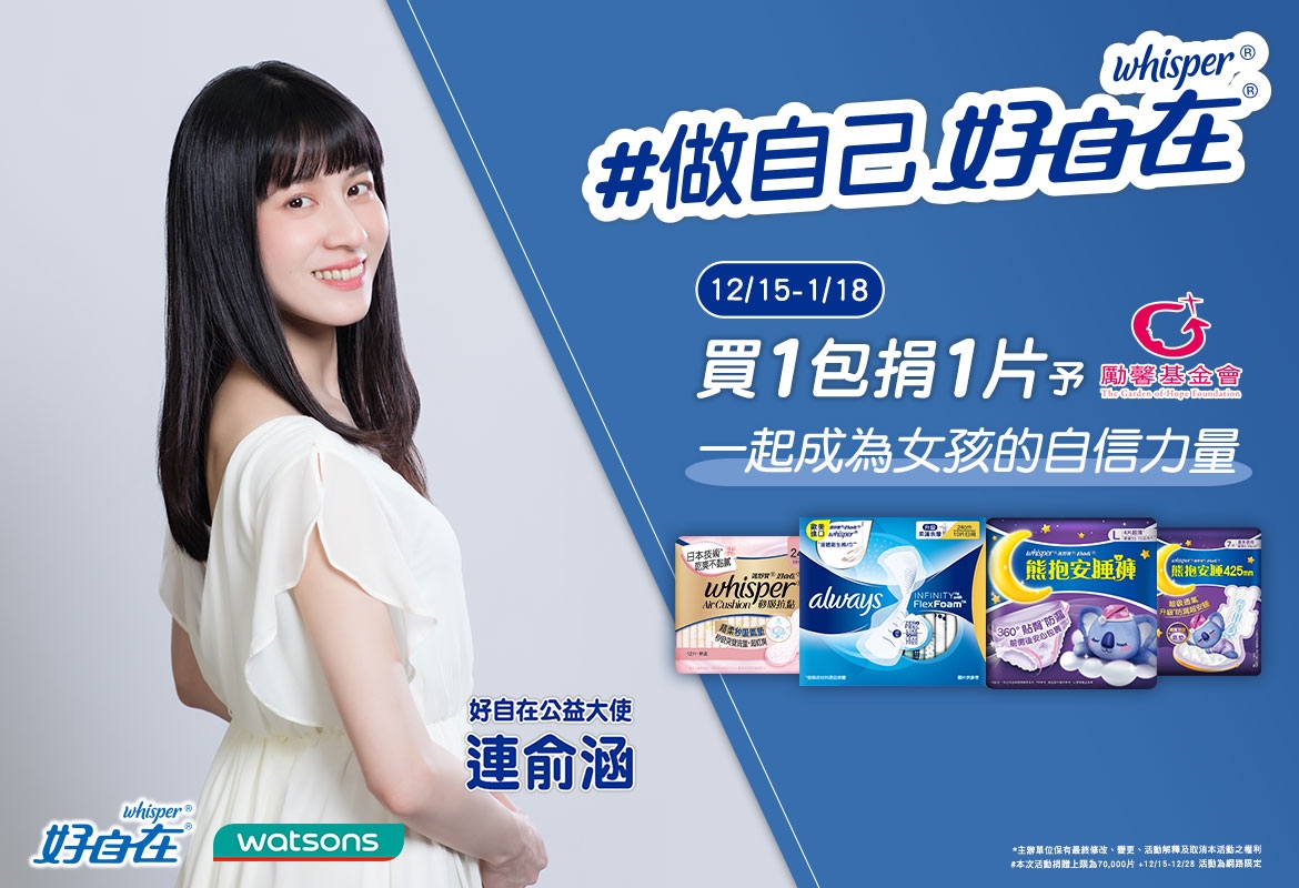 P&G寶僑家品旗下好自在長期關注女生自信發展,近期與屈臣氏共同發起「#做自己好自在」活動,更邀請曾入圍金鐘獎戲劇節目女主角獎的連俞涵擔任公益大使,為女生自信力發聲,並透過「買一包捐一片」的消費行動,支持勵馨基金會陪伴的近千位女孩自信成就更美好的自己與未來。