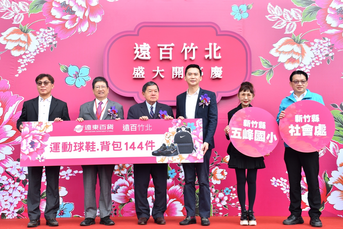 因山區學校資源較為缺乏,孩童在成長期間充足的運動量更顯重要,新竹縣五峰國小在各大運動賽事表現突出,遠百竹北在開幕之時希望提供優質、耐用的運動用品讓大家動起來舒適,健健康康成長茁壯,公益捐贈儀式由遠東集團徐旭東董事長、遠東百貨徐雪芳總經理代表捐贈逾百份知名運動品牌背包及球鞋給新竹縣五峰國小學童,並由新竹縣楊文科縣長、竹北市長鄭朝方、五峰國小朱陳國智校長與新竹縣產發處陳偉志處長代表受贈,讓偏鄉學童在新的一年可以無後顧之憂的自在學習,以行動力挺公益、讓愛持續傳遞。