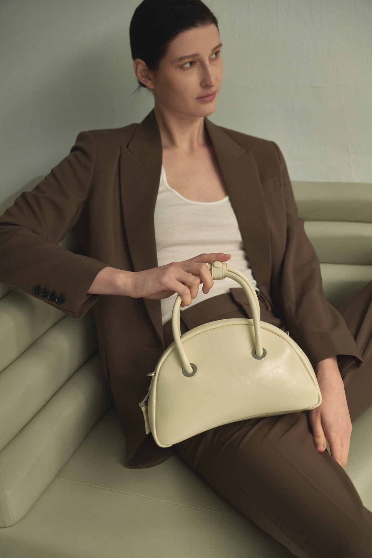 人氣熱銷款!選用防水塗層帆布與環保純素製作,以月牙狀的輪廓為靈感,設計小巧但空間充裕,整體縈繞著柔美的質感。