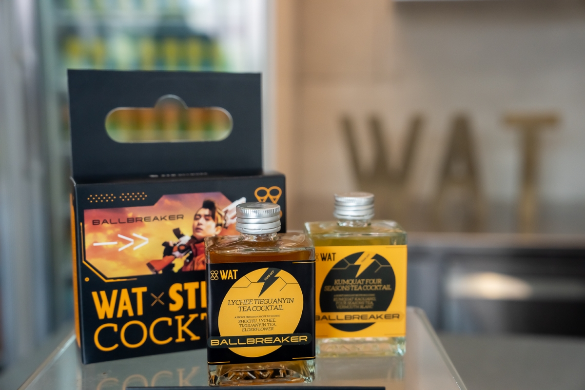 2023 曾博恩世界巡迴《破蛋者》BALLBREAKER 跨界聯名 WAT 雞尾酒。四季金桔芬芳迷人的四季春,搭配清新金桔香氣。貴妃鐵觀音保留貴妃荔枝的果肉滋味,混合鐵觀音特有煙燻木質香氣雞尾酒。包裝承襲破蛋者賽博龐克風的潮炫設計,透過酒瓶撕拉標的入教儀式,一同成為最潮的破蛋者。隨禮盒附贈「限量暴鐳閃卡」,一共四款 ,還有機會抽到極限量博恩親簽閃卡,「暴鐳彩蛋」目前在WAT信義店、赤峰店、勤美店現貨販售中;全家便利商店熱烈預購中。