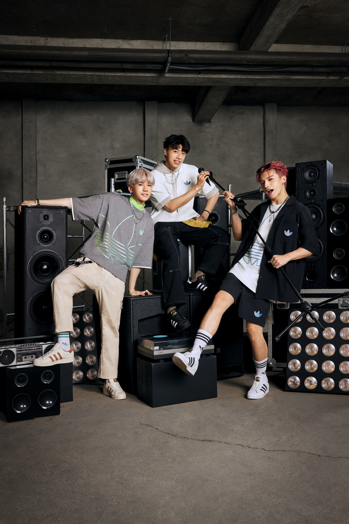 形象照中子翔以一身亮眼的湖水綠套裝亮相,古巴領襯衫套裝內著趣味塗鴉設計短T,散發青春夏日氣息,腳踩著經典白黑SUPERSTAR,呼應上身吸睛的清爽亮色系穿搭。煥鈞作為舞蹈擔當穿出運動工裝風,以短 T 內外疊搭技巧提亮整體造型,下身搭配黑白SUPERSTAR以酷帥 All Black展現獨特街頭個性。佳辰則穿出City Boy城市男孩風,以混搭和層次作為穿搭核心,ADVENTURE 口袋拼接設計黑色短袖上衣,搭配同系列卡其色機能工裝褲,配上全新復古奶油橘配色 SUPERSTAR  ,特殊復古色調為整體穿搭點綴無限玩味!