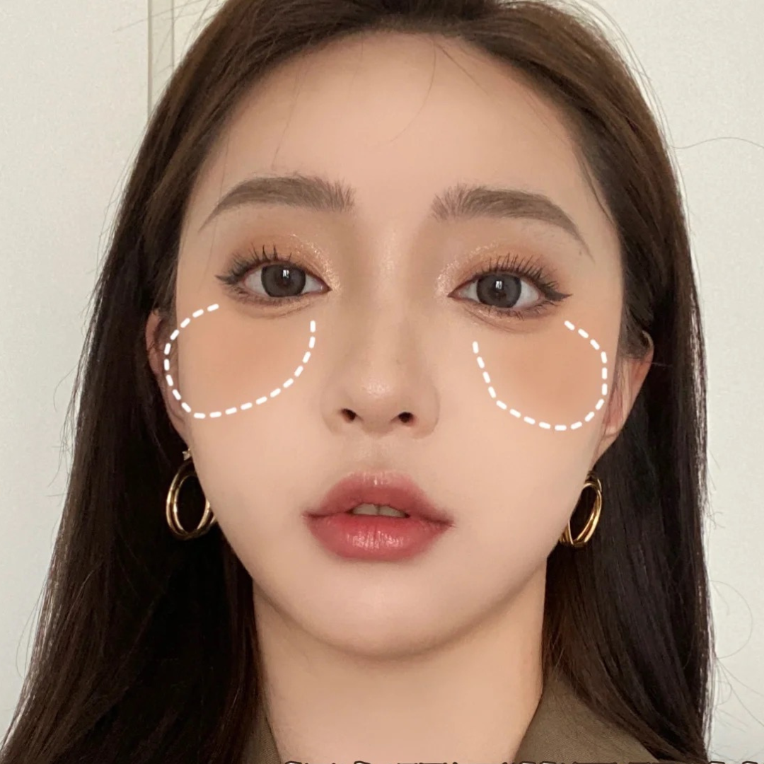 打在眼下的是一種很常見的腮紅畫法,手法很簡單,可以先用比膚色淺、且明度較高膨脹色腮紅搭配小刷子在淚溝與黑眼圈中間的三角區先輕輕掃上一層,起到一個打亮的作用,再使用氛圍色腮紅從眼角延伸至蘋果肌膚位置,打造倒三角形狀,甜美日系氛圍中帶點顯嫩的無辜感。