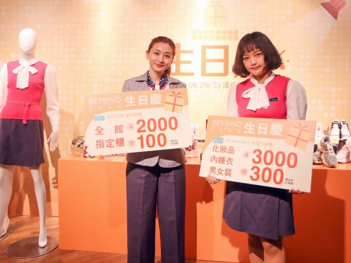 生日慶檔期於06/08(四)起正式開跑,為期18天,首四日持台新比漾聯名卡於化妝品/內睡衣/男女裝/床寢區單櫃刷滿3,000贈300;首四日及每週五六日,持比漾卡於全館指定櫃單櫃滿2,000贈100,與大家電/珠寶區/施舒雅/KARADA單櫃滿10,000贈500等活動;另享聯名卡專屬滿額禮及比漾卡來店禮,最高回饋18%!