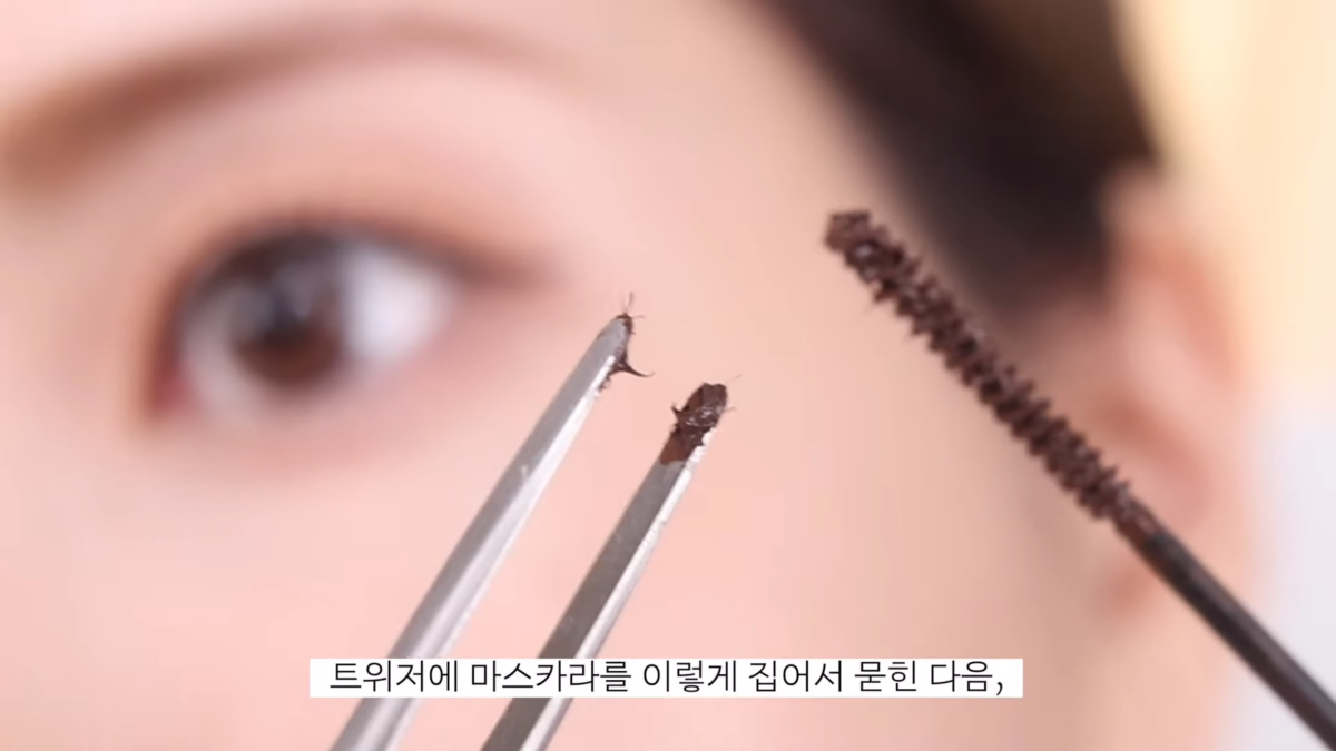 如果在用鑷子夾睫毛時發現睫毛不好成束,可以直接用鑷子沾取睫毛膏,讓膏體附著在鑷子上再夾睫毛,這樣會更好捻成一束一束的樣子。