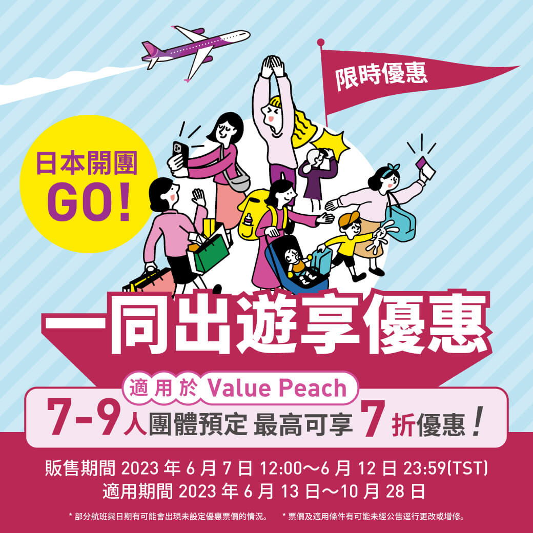 樂桃航空新推出「\來趣桃 /一同出遊享優惠」,邀請7-9位旅客同時訂購同航班前往日本(台北、高雄出發皆可),就享有最多30%折扣,票價種類為Value Peach,就是可以攜帶7.0kg以內的手提行李登機、免費託運行李1件,還有免費指定標準或樂享座位,以及免收更改航班手續費…等好康,「\來趣桃 /一同出遊享優惠」出發日期為6月13日至10月28日,快點揪上親朋好友一起出發!