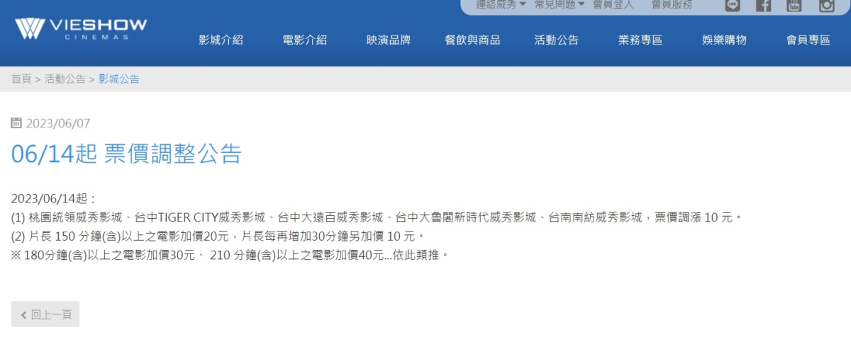 欣欣秀泰漲聲響起,威秀影城也確定跟進,官網正式發布消息,從6/14開始,以下這五間據點:桃園統領威秀影城、台中TIGER CITY威秀影城、台中大遠百威秀影城、台中大魯閣新時代威秀影城、台南南紡威秀影城,各大票價調漲NT$10元。