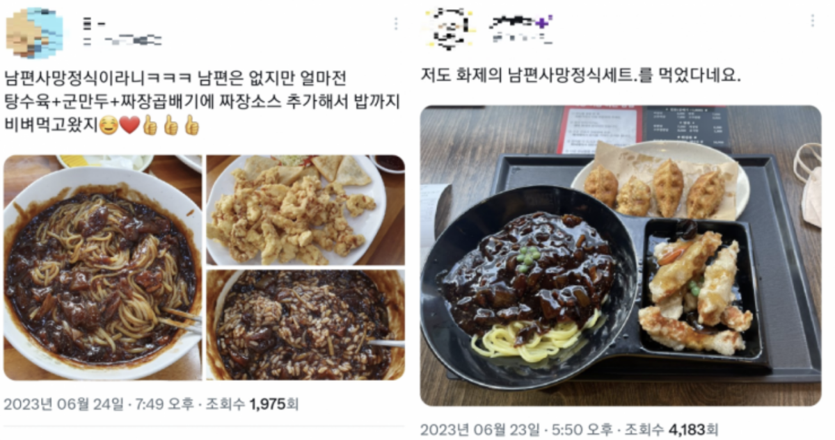 劇中成為話題的「喪夫套餐」始於第2集,因丈夫死亡而接受警方調查的尚恩(林智妍 飾)在警察局中看著其他人吃炸醬麵而偷偷吞口水,隨後她就馬上前往附近的中餐館點了炸醬麵、糖醋肉、煎餃還加了一瓶可樂,雖然臉很臭但吃得卻很香,狼吞虎嚥大快朵頤的模樣讓觀眾彷彿看了一場吃播!據說連劇組拍完後都忍不住跑去點了同款宵夜XD