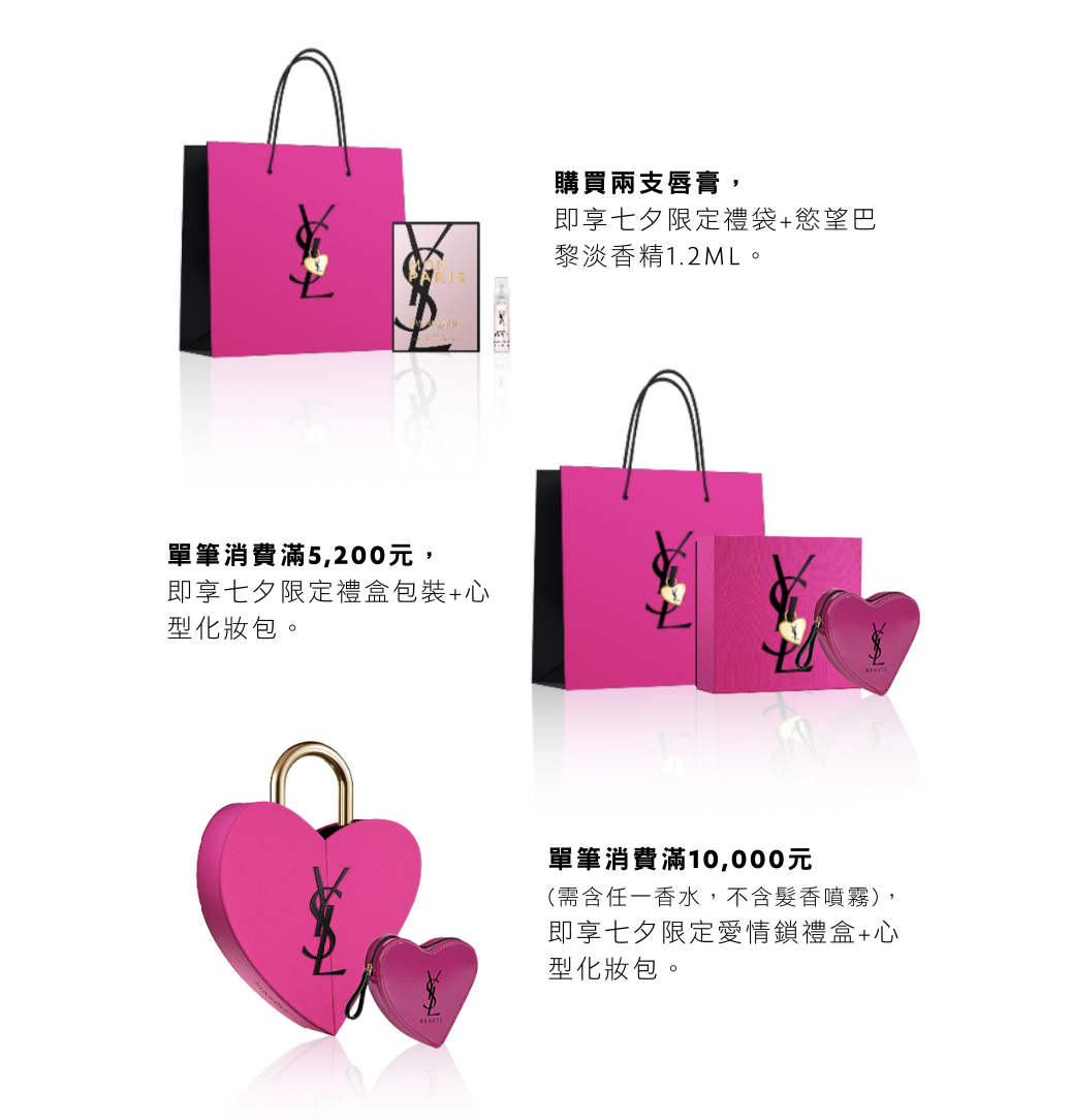 七夕無論單身還是熱戀中,絕不能錯過這唇膏香調滿分、外型大加分的YSL限定組合!經典Le Coeur心鎖繫上性感香氛與訂製禮贈心動滿分!購買2支唇膏,就送七夕限定禮袋與慾望巴黎淡香精1.2ML。另外還有,單筆消費滿5,200元,就會獲得七夕限定禮盒包裝與心型化妝包。單筆消費滿1萬元(需含任一香水,不含髮香噴霧),立即享有七夕限定愛情鎖禮盒與心型化妝包,在情人節夜晚獻上赤裸真心,擁有這組合,彼此誰也逃不出愛情鎖!