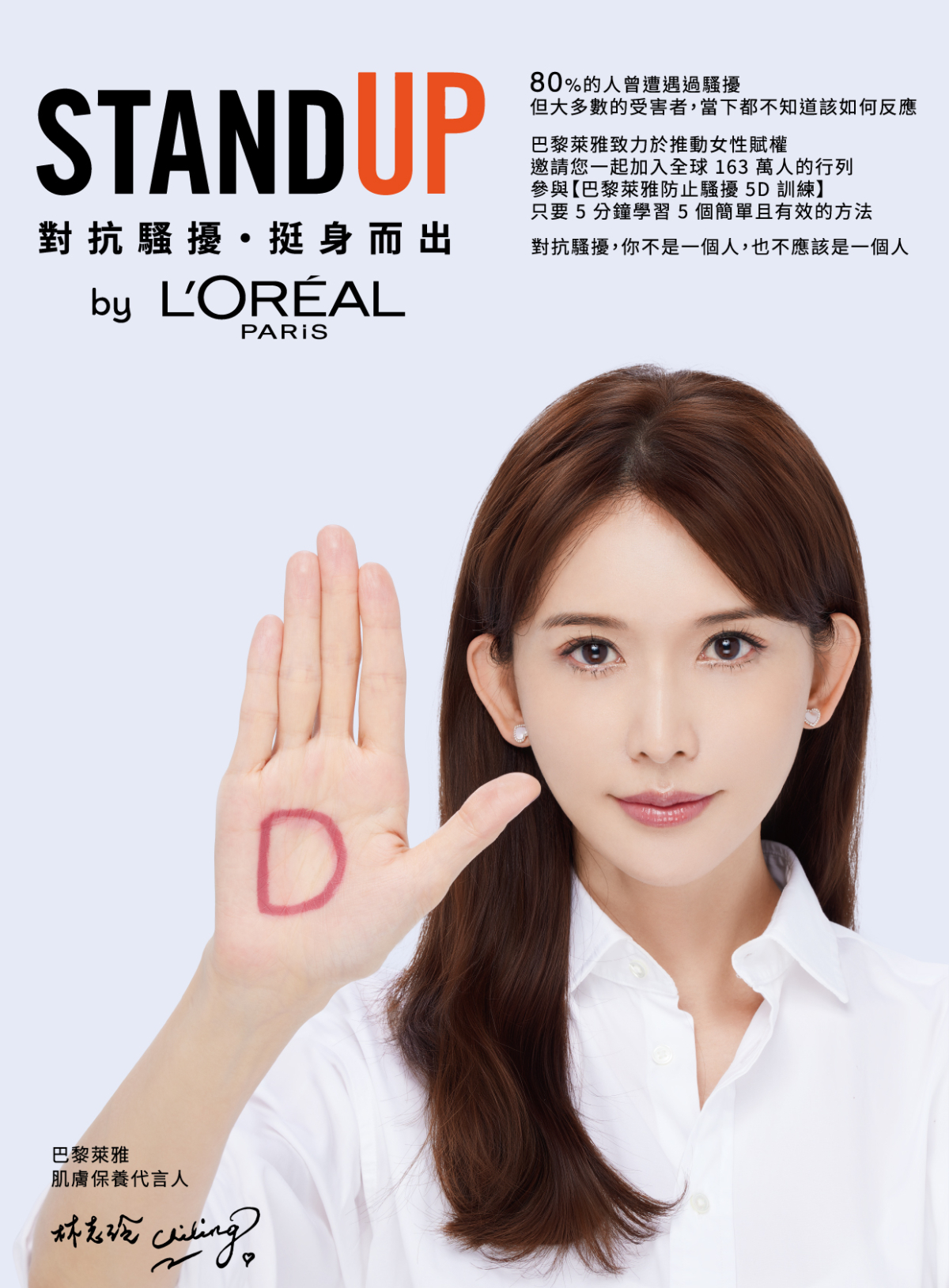 根據巴黎萊雅委託調查,高達八成的女性曾經遭遇或目睹過性騷擾,並且高達86%的女性在街頭遭遇性騷擾的當下不知道如何干預,同時有女性表示:雖然在校園課程中知道性騷擾的定義,但真的遇到當下卻不知道如何作為。因此巴黎萊雅品牌發起「STAND UP 對抗騷擾,挺身而出」計畫,攜手志玲姐姐參與該計畫,志玲姊姊更提出呼籲:「希望大家一起STAND UP挺身而出,面對騷擾你不是一個人,也不應該是一個人!」【拒絕騷擾 5D 訓練】是巴黎萊雅與非政府專家組織 RIGHT TO BE (原名:Hollaback! )共同合作開發並證實有效的一套方法,登入Stand Up 官方訓練網站,只要5~10分鐘便可以快速了解安全有效的5D方式來應對騷擾或是提供協助,志玲姊姊同時鼓勵大家,希望不論男女,一起學習巴黎萊雅5D訓練計畫,在可能突然遭遇街頭騷擾,或只是目睹騷擾狀況,都可以運用5D方式,來做出適當安全的行動或提供協助。
