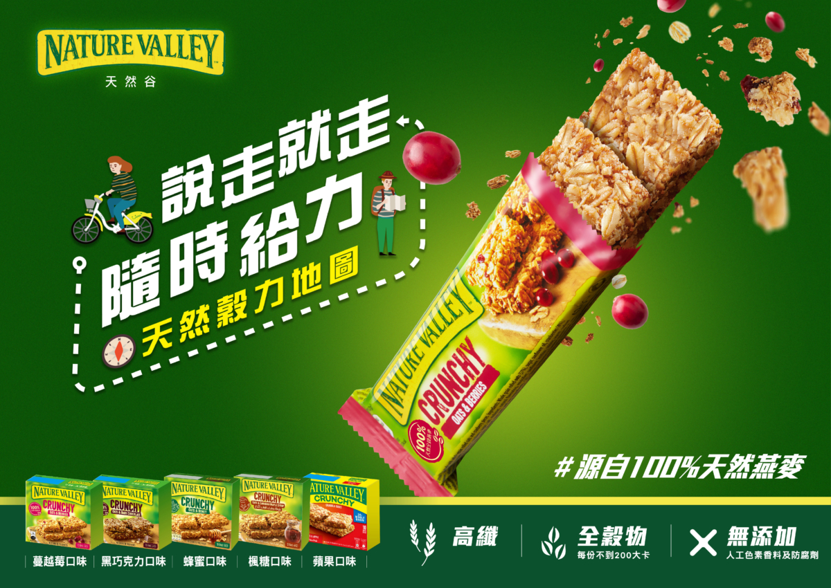 Nature Valley天然谷一直以來都鼓勵人們可以多與大自然接觸,感受大自然帶來的活力與能量,近期更舉辦了「說走就走,隨時給力-天然穀力地圖」活動,以時下最流行的camping及biking兩大運動為主軸,除了邀請KOL Yin和小豬黃沐妍一同參與外,7月底開始也將與愛露營平台及YouBike合作,到愛露營指定營區或於7/21-9/20在YouBike台北、台中、高雄任一站點借還車,就有機會獲得穀力好禮喔!快跟著Nature Valley及小編一起輕鬆走出戶外,享受大自然的美好!