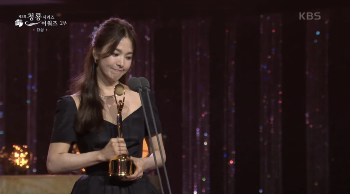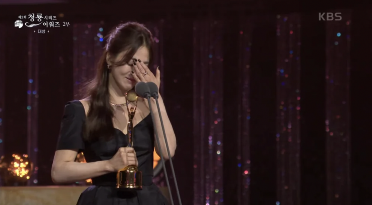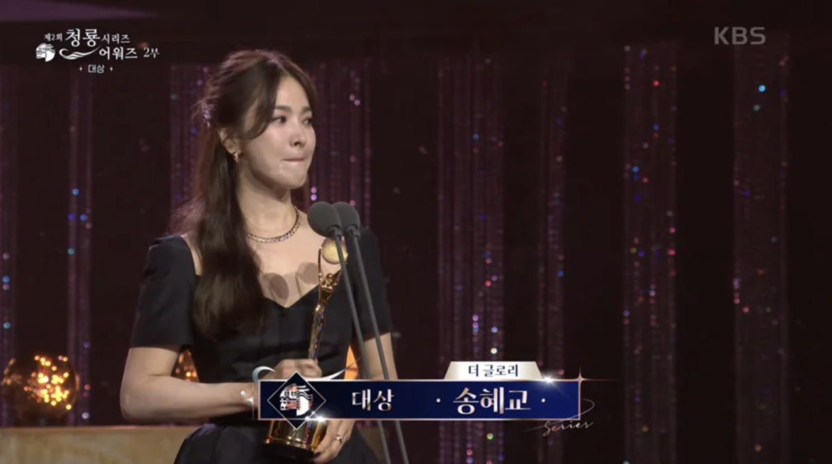 第2屆《青龍系列大獎》於5月19日圓滿落幕,宋慧喬雖然沒有得到電視劇部門最佳女主角,不過拿下了《青龍系列大獎》最大獎「大賞」,宋慧喬發表感言時聲音幾乎全程哽咽、像在努力忍著不哭,沒想到台下突然傳來男粉大喊打氣:「好漂亮宋慧喬!」讓她破涕為笑。