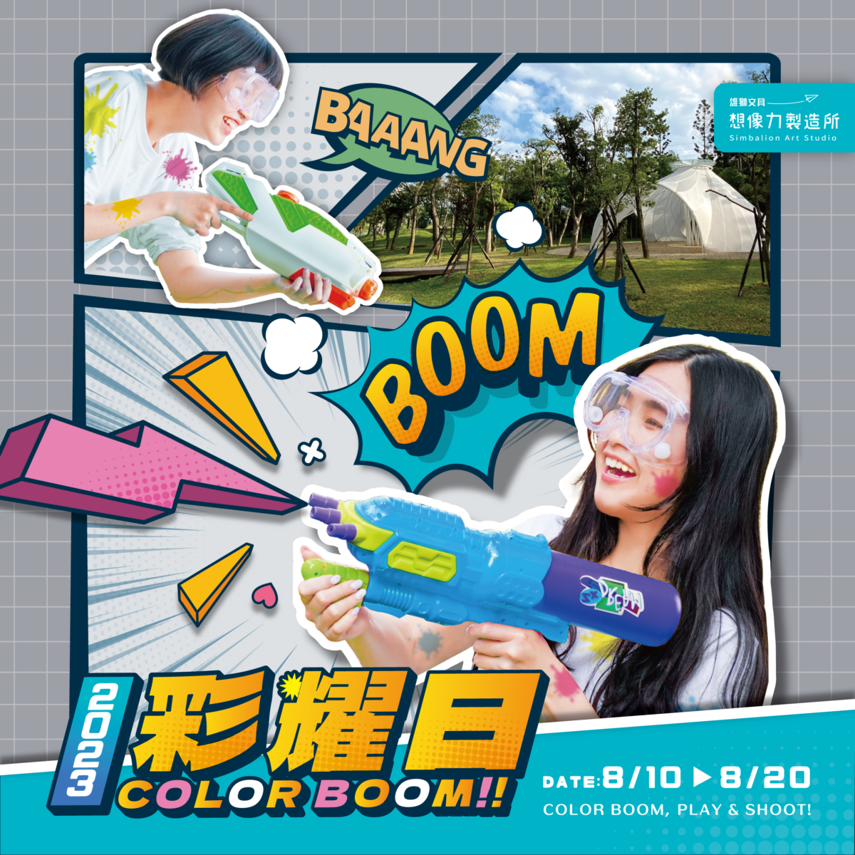 「2023彩耀日COLOR BOOM!!」將藝術創作與水槍射擊相互結合,打造了兩大色彩實境遊戲「繽紛色擊」及「流彩碰撞」。並特別採用安全又方便的可水洗顏料,讓大家透過直覺的方式享受互動藝術,並發揮想像力大膽創造!與同伴一起在歡笑聲中,創造出最獨特的藝術作品。