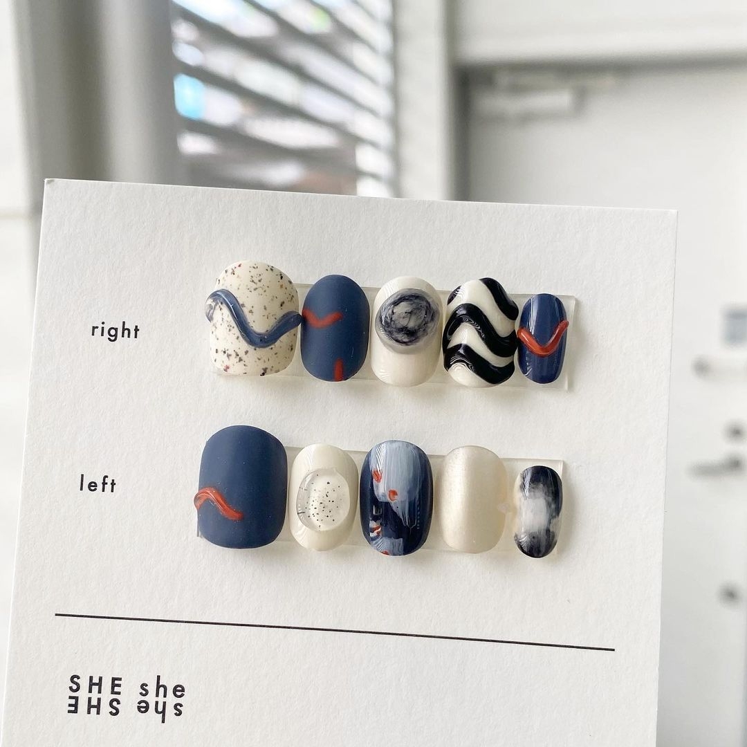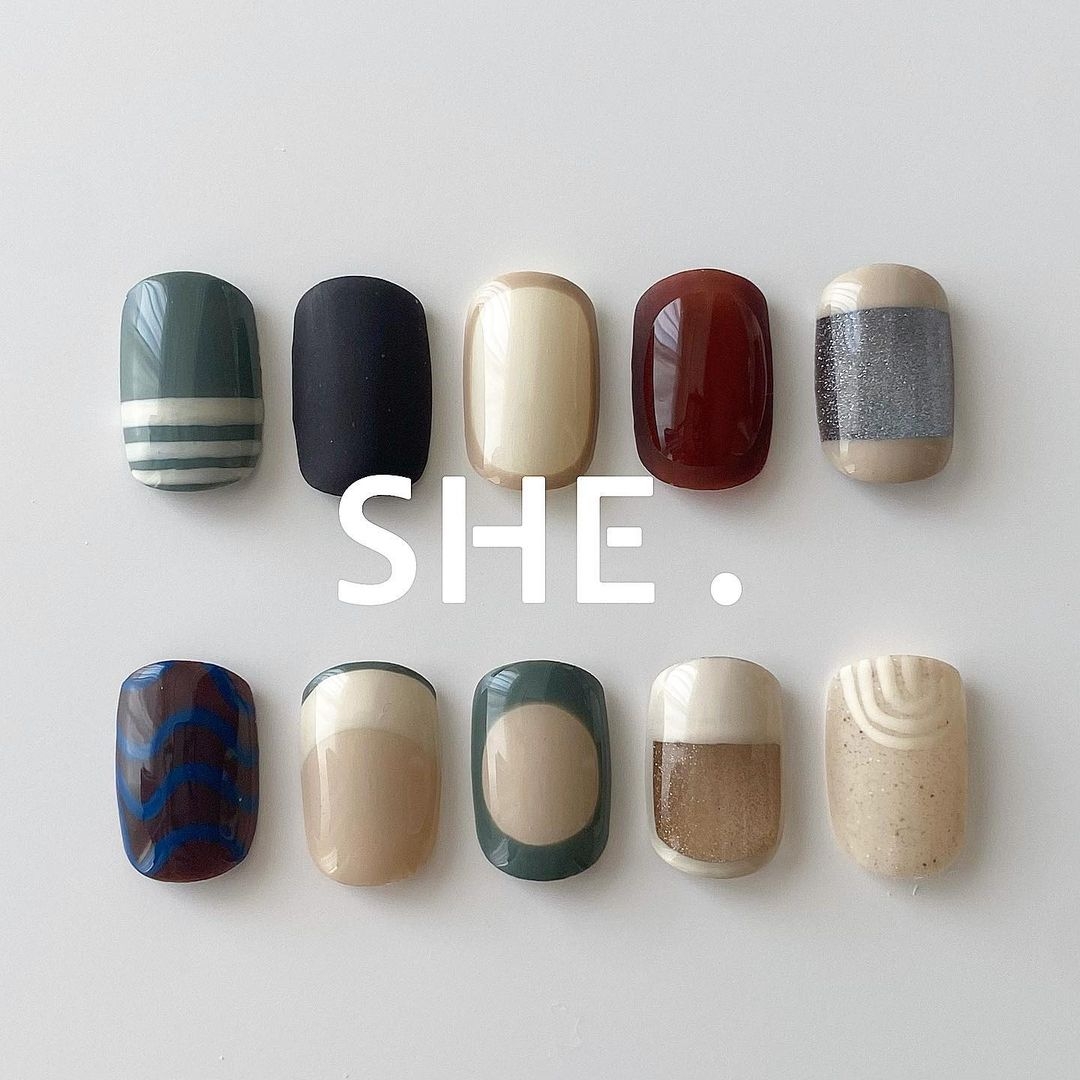 在日系美甲中「復古撞色」也是很常見的款式,有別於歐美的螢光色系、韓風的小圖案點綴,日系美甲更擅長用「低飽和」的顏色來打造整體氛圍。