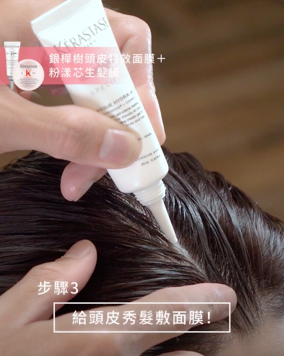 清潔乾淨之後就會幫頭皮敷上專屬的「銀樺樹頭皮特效面膜」以及為髮絲敷上「粉漾芯生髮膜」,可以讓髮絲鎖水保濕,同時強韌預防斷裂,達到深層滋養的效果,讓髮絲在這步驟可以變得柔軟有光澤~