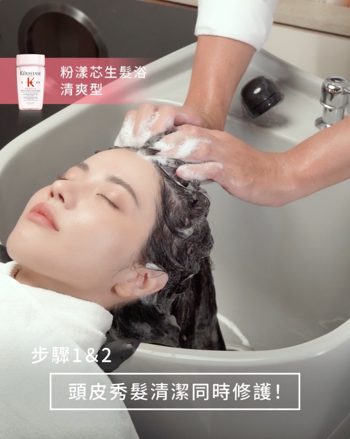 奢養療程從一開始就有專業設計師為頭皮秀髮做諮詢檢測,接著就是使用KÉRASTASE 巴黎卡詩粉推出的「粉漾芯生全系列」養護操作,從第一步用「粉漾芯生髮浴 清爽型」幫頭皮及秀髮深層清潔油脂髒污、同時修護,還添加了「薑根萃取」去活化頭皮肌膚,還有「高山雪絨花精萃」讓頭皮秀髮的防禦力upup!