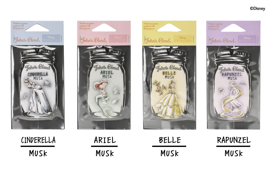 在居家芳香用品很有名的JOHN'S BLEND,與迪士尼公主們合作多款商品,並配合每個角色設計出不同色系、香味的產品,官網也有詳細寫上每一款的味道,大家購買前可以先上網查詢唷。