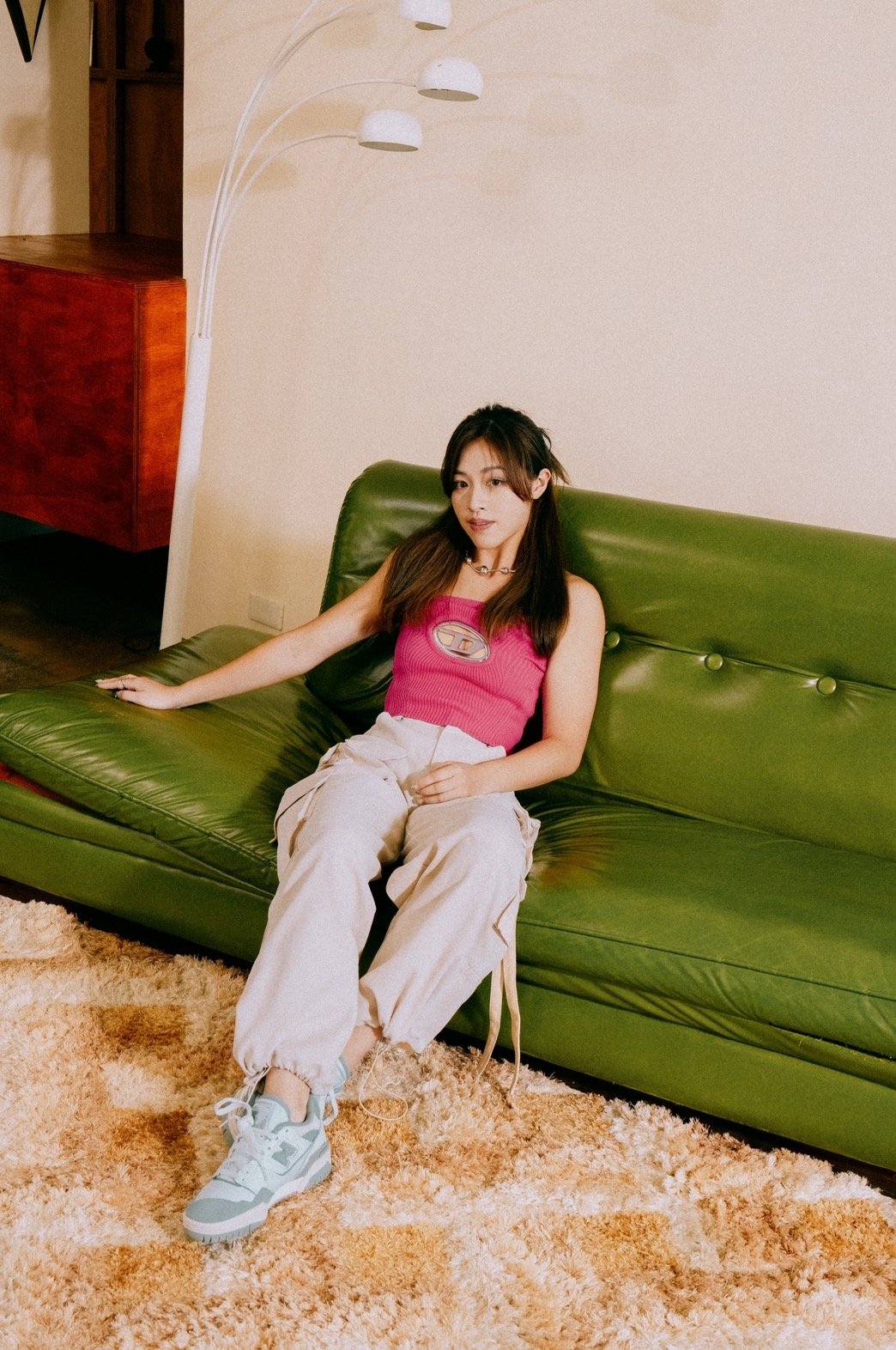 夏天穿出微甜陽光感是必須的吧~短版上衣搭配工裝褲,有點甜卻又不乏率性街頭感!Megan選擇了近期相當流行的桃粉色Y2K短版平口上衣+白色工裝褲,搭配550湖水綠,又是一個撞色小巧思,整體酷酷有個性卻不失少女甜美!