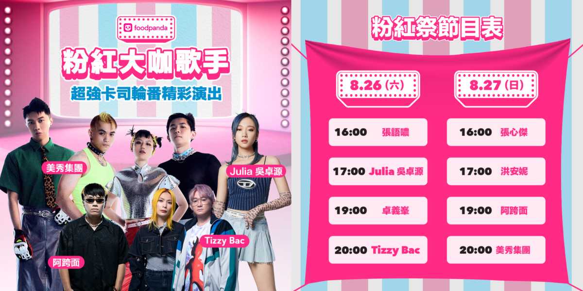 夏天的重頭戲不能少了歡樂的音樂祭,8 月 26 日 至 8 月 27 日「叫 foodpanda 送!粉紅祭」現場邀請大咖藝人歌手獻聲同樂,氣氛即將嗨到最高點!重量級卡司包含 R&B 小天后 Julia 吳卓源、賽博台客美秀集團、選秀冠軍張語噥、KTV 熱門點播歌手卓義峯、牢騷系樂團Tizzy Bac 、實力唱將張心傑、創作歌手洪安妮、大嘻哈時代2冠軍阿跨面,從下午四點開始輪番上陣,一起搖擺、熱情吶喊!