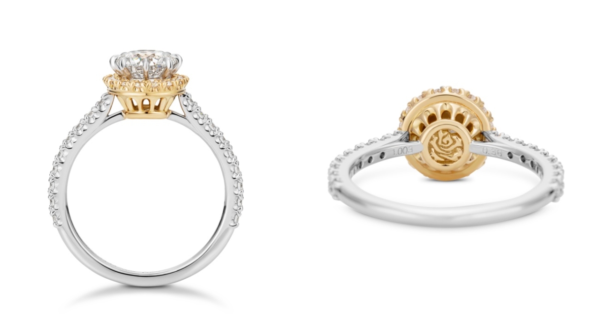 當野獸深深被貝兒吸引的那一刻起,便用畢生的溫柔對待屬意的她,最後貝兒發覺了野獸待她的真心與善良,兩顆心越來越靠近,心意相通的兩人最後攜手走向美好愛情。Brilliant Romance – Belle的座台設計就是取自貝兒與野獸心靈相通時翩翩起舞的宴會廳,輝煌的大廳裡隨著音樂譜下一段愛情宣言,鑲嵌約1.0ct的圓形車工鑽石在鑽戒上,K.UNO將引領兩人找到真愛的「魔法玫瑰」圖案點綴在座台內側,最後再鑲嵌上襯托主鑽的34顆配鑽,讓愛意隨著閃亮光芒延續下去