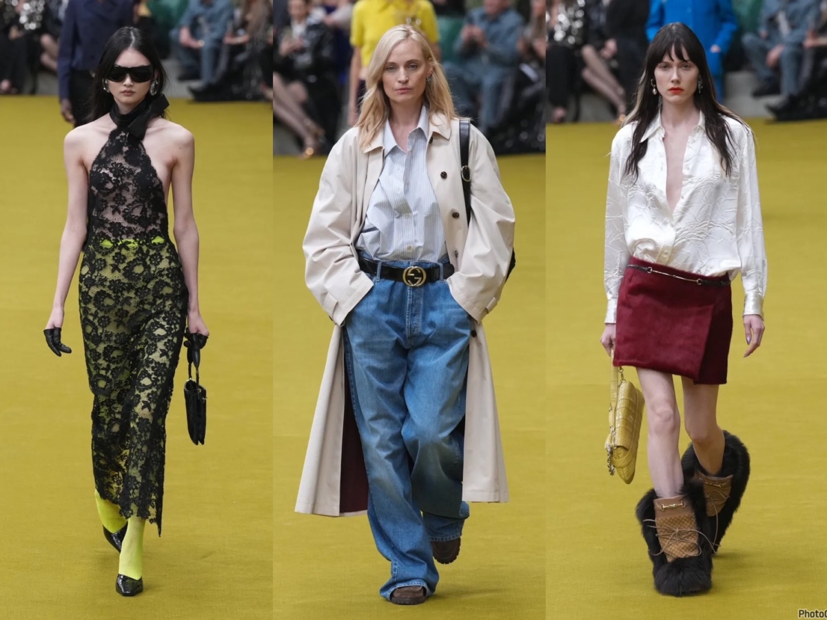 還記得今天二月時的米蘭秋冬,是首場Gucci 前任創意總監Alessandro Michele正式卸任的第一場秀,不但並不空洞,設計團隊反而帶來了無限的驚喜,為了向品牌歷史致敬,將系列呈現出他們記憶中不同時期的品牌歷史,服裝剪裁令人想起 Gucci 在 1990 年代和 2000 年代初期的性感和迷人的設計語言,卻換上2010 年代的濃厚色調,不再只是單純的放大或縮小,從開場裸露的鑲嵌水晶 GG 金屬內衣、古怪廓形卻份量感十足的人造皮草大衣和毛茸雪地靴,可看出本季三大設計重點:性感透視內衣、華麗毛絨和搖滾包致敬,徹底道出Gucci蘊藏無窮的品牌精神!