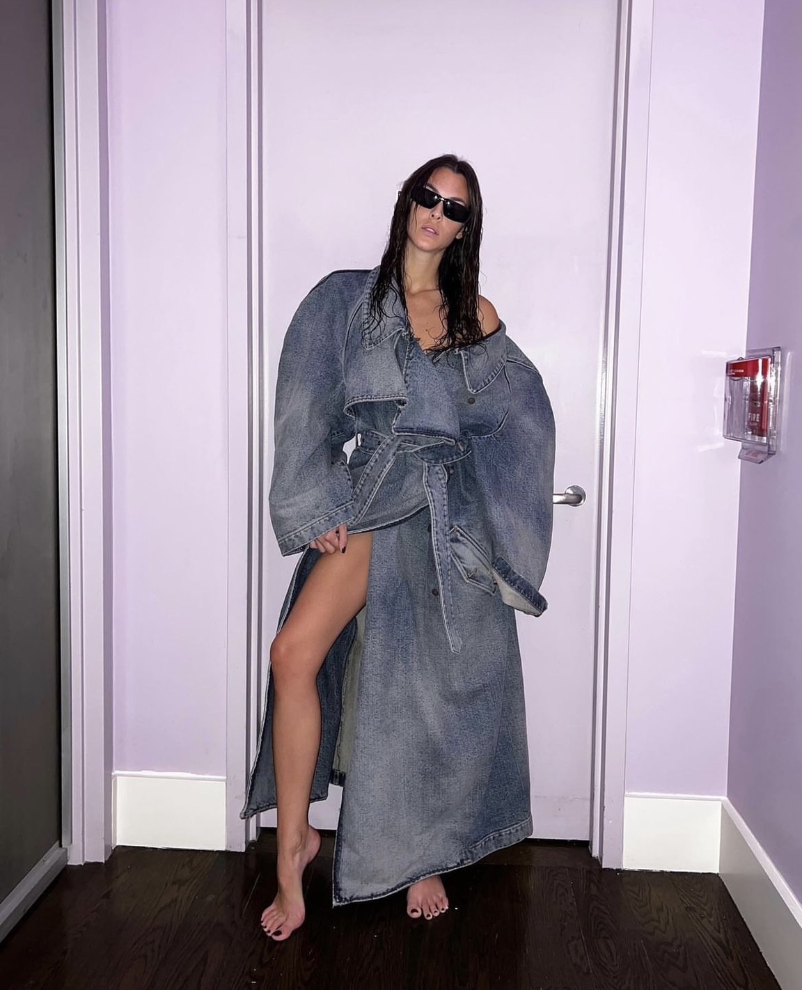 受許多品牌及創意總監寵愛的超模Vittoria Ceretti雖然不常公開私服穿搭,但從社群上可見,不管是任何品牌、服裝款式和材質,她依舊能完美襯托!這件不規則剪裁丹寧風衣外套,肩線弧度及廓形以硬挺呈現,展現氣勢的視覺效果,裙身採開岔設計更能在酷帥中流露一些性感!
