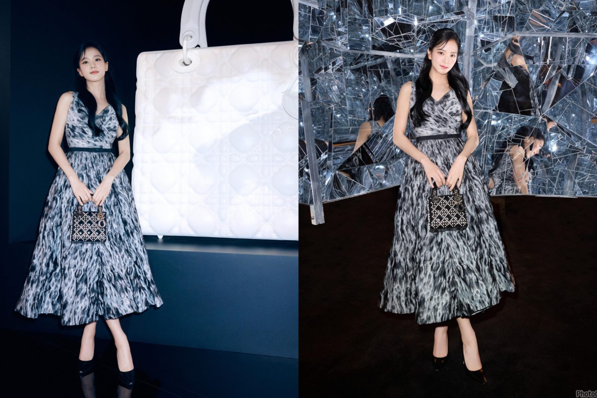 Jisoo 選擇穿上Dior 2023 秋冬系列印花洋裝與 Lady Dior 手袋,浪漫長捲髮搭配精緻粉嫩系淡妝,以柔美黑白色系展現靈動氣質,也呼應這次展覽給人的藝術氣息。