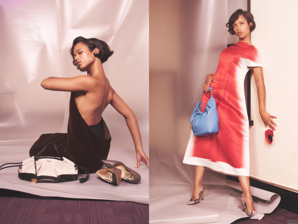 LOEWE 2023 秋冬女裝系列廣告由 David Sims 拍攝,在怪異的現實環境中透過人物身體姿態及凝視呈現自我,虛幻的意境與秋冬系列重點的模糊印花圖騰設計呼應!LOEWE 全球品牌大使湯唯與Taylor Russell彷彿置身於時間暫停的靜止空間,手中拿著鏡子、太陽眼鏡、可摺疊的 Puzzle 托特包及納帕小羊皮製成的 Squeeze 包款,搭配可調節長度的鍊帶及柔潤觸感的皮革皺褶手柄,單品輕巧形態及精緻手工更加突顯了時間凝固的畫面。
