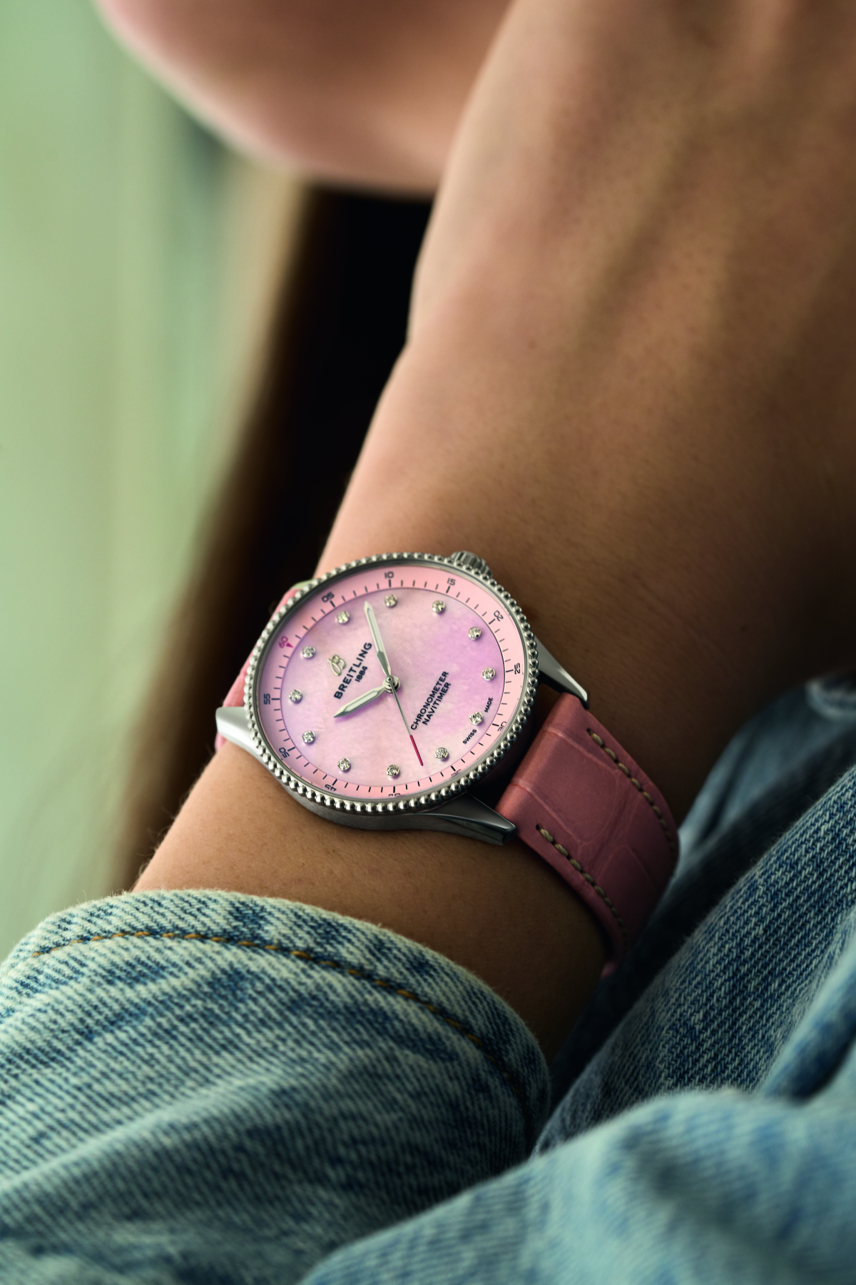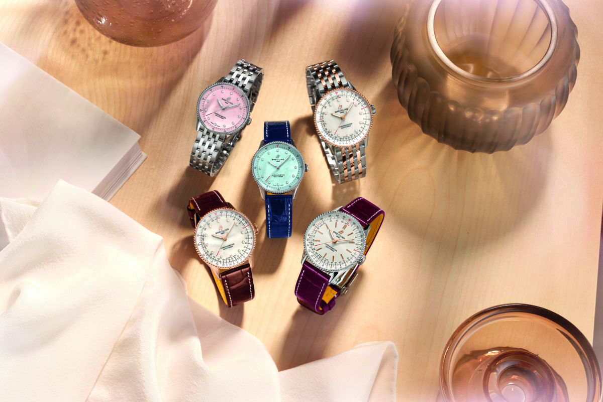 這款36毫米Navitimer航空腕錶採用圓珠錶圈和標誌性的圓形飛行滑尺(飛行員將其此功能當作小算盤),使Navitimer航空腕錶外觀清晰無誤。但在這裡,有 三種別緻的金屬錶盤顏色(薄荷綠、銀色和灰色),帶有小時刻度,或者以圓形切割「更優質的鑽石」鑲嵌在白色珍珠母貝錶盤。
