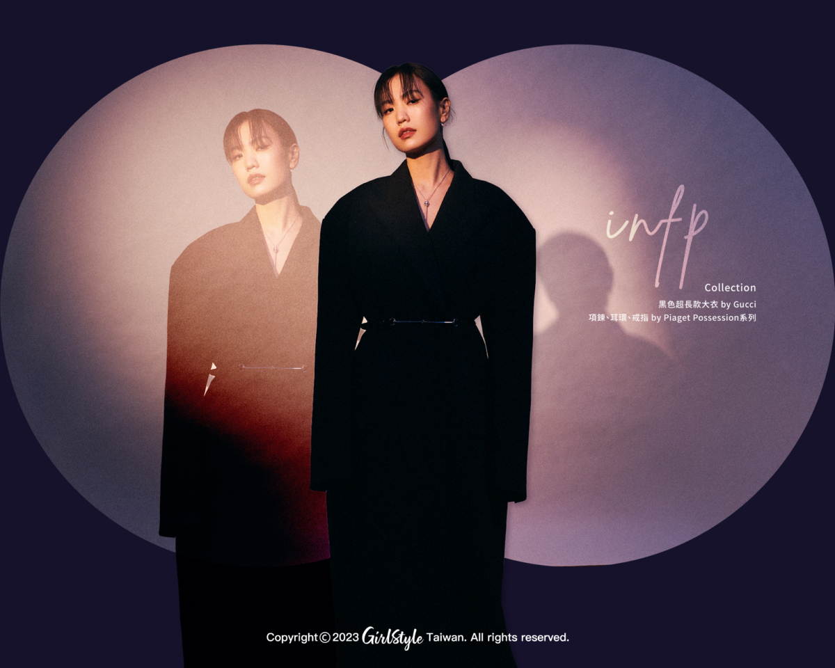 「霸氣宣言」的風格比較像是記錄了她這些年的創作心路歷程,在迷惘及困境中找到了堅定有力的立足點。這套黑色超長版西外以誇張廓形的厚重感,呈現自信又堅定的氣息,腰間綴以極細的金屬鍊帶,有些中性又有些女人味。飾品方面,孫盛希提到平常特別喜歡選擇戒指作為配戴,不喜歡太過浮誇、花俏,簡約有型且稍稍中性的設計反而更能深得她心。