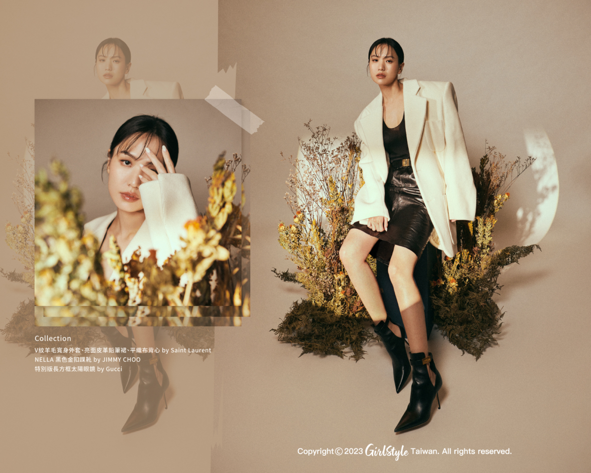 Style / V紋羊毛寬身外套、亮面皮革鉛筆裙、平織布背心 by Saint Laurent ;JIMMY CHOO NELLA 黑色金扣踝靴;Gucci 特別版長方框太陽眼鏡 。