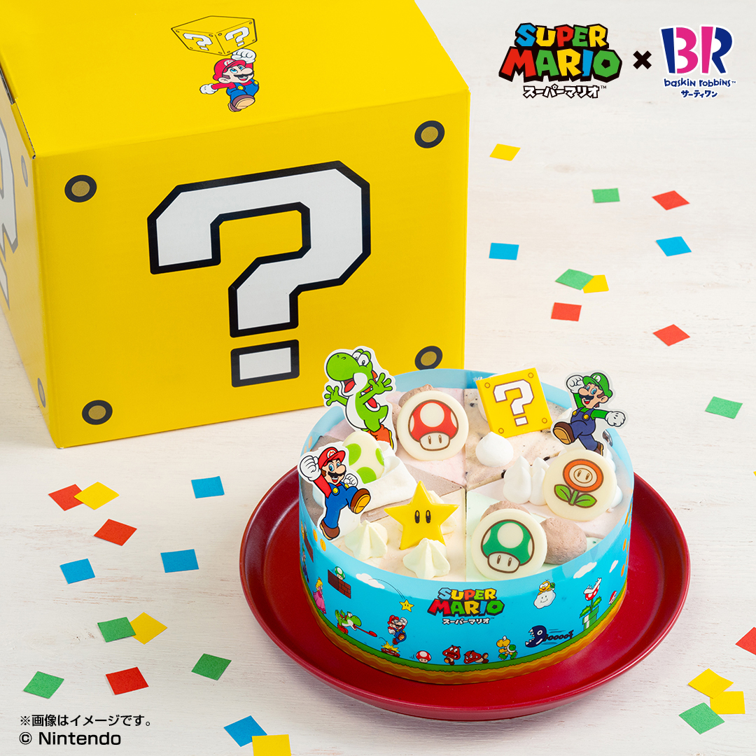 最後還有「超級瑪利歐」冰淇淋蛋糕可參考!上面有著用巧克力做成的強化道具,裡面每一塊蛋糕也都是不同口味(有包含這次兩款限定口味),整體配飾都是以瑪利歐為主,就連包裝盒都是以經典的問號方塊盒子為設計,是不是超適合當作生日蛋糕的驚喜~
