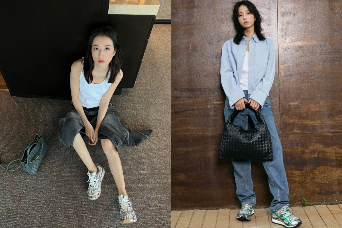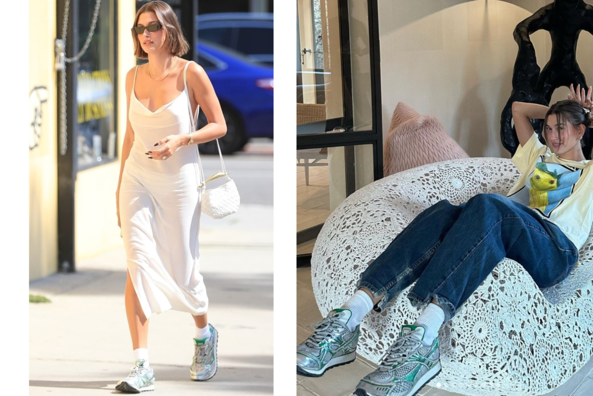 Hailey Bieber在IG上曬出一張與Bottega Veneta Orbit 運動鞋的合照,身穿休閒黃色T-Shirt搭配牛仔褲,隨性簡約的穿搭更讓腳上的綠色網眼鞋款成為亮點;另一套則換上白色連身裙,同樣搭配綠色網眼鞋款,完美證明休閒隨性或浪漫優雅的造型都能百搭這雙鞋!