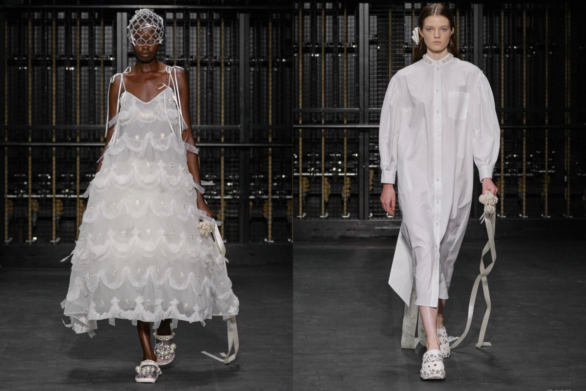 整場秀最受矚目的莫過於 Simone Rocha 與 Crocs 攜手合作的聯乘鞋款,Crocs以防水橡膠、輕巧又舒適的設計為主,雖然曾被稱為時尚大災難,卻仍有眾多時尚品牌和名人搶著聯名和追捧,這次與Simone Rocha的聯名在鞋面上填滿巨大珍珠與寶石,營造出叛逆龐克少女的獨特氛圍,徹底顛覆大眾對Crocs的固有印象!