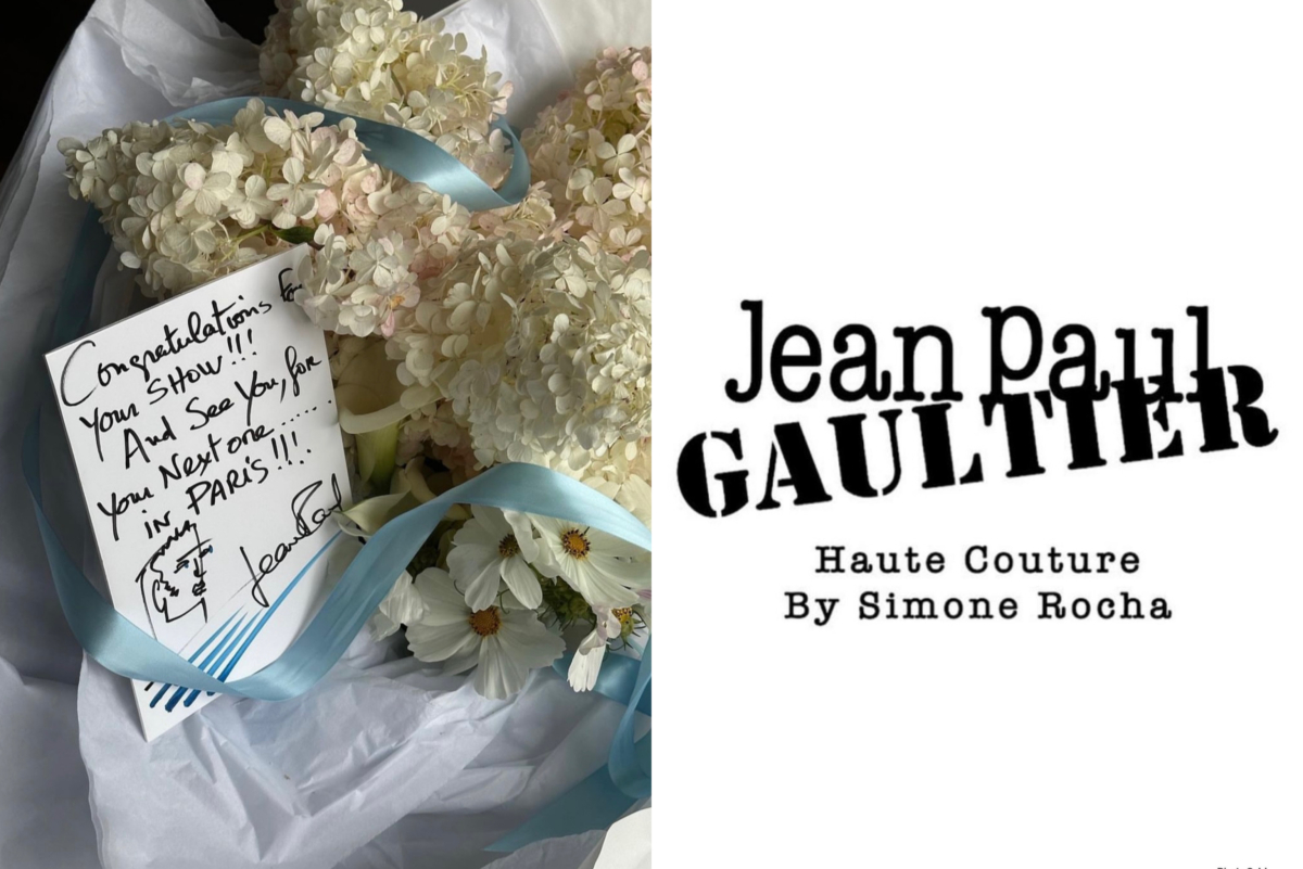 Simone Rocha 在 Instagram 上發佈一則貼文,裡面有一束慶祝花束還有 Jean Paul Gaultier 的手寫卡片,寫下:「恭喜妳的演出!!下一場在巴黎見!」驚喜道出兩方品牌將聯手打造合作系列,於 2024 年 1 月的巴黎時裝週期間展出。