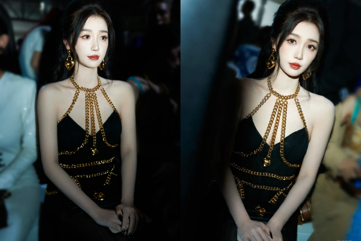 這是虞書欣成為Moschino最新品牌代言人後出席的第一場時裝大秀,勢必期待值爆表!她選擇Moschino 2024早春系列的黑色鎖鏈連身裙作為戰袍,上身鎖鍊設計呈現高貴奢華感,下擺則是若隱若現的透視感紗裙,手拿Moschino小牛皮手拿包及愛心耳環,頭髮盤起Moschino秀場標誌性的高顱頂髮型,整體顯得復古許多。
