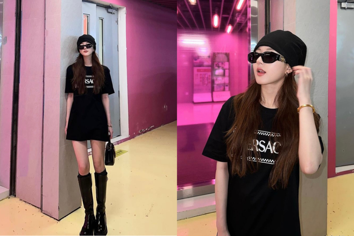 趙露思前往米蘭的機場穿搭選擇走低調休閒路線,一身Versace 黑色寬鬆T-Shirt搭配黑色毛帽與黑色及膝長靴,露出一雙纖細長腿,手上同樣拿Versace最新秋冬系列 Greca Goddess Top Handle手提包,身上的飾品也全來自Versace,包括希臘迴紋耳環、手鐲以及不規則太陽眼鏡,機場穿搭總要最舒適又漂亮!