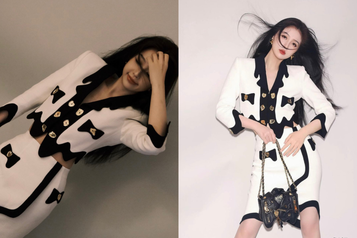 虞書欣過去雖然被評比為看不懂的時尚角度,但在這次時裝周卻穿出了獨特的個人Style,行頭自然全是出自他代言的品牌Moschino,出發當天先以Moschino 2023秋冬系列黑白相間套裝亮相,手拿黑色Moschino鏈條包,衣服下襬和裙身呈現不規則設計,有種幹練卻不枯燥乏味的職場女強人既視感。