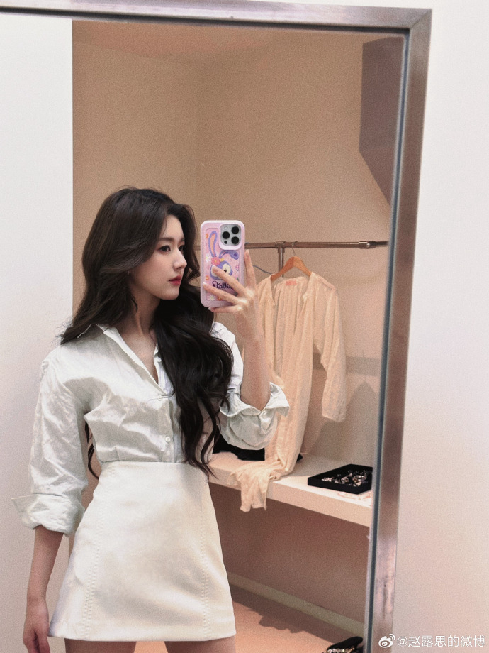 趙露思以白色襯衫搭配同色A-LINE短裙,搭配蓬鬆大捲髮完美詮釋幹練不失女人味的態度。建議襯衫可以挑選向她那樣的廓形剪裁並拉開領扣露出纖細鎖骨線條,更能藏肉優勢身形。