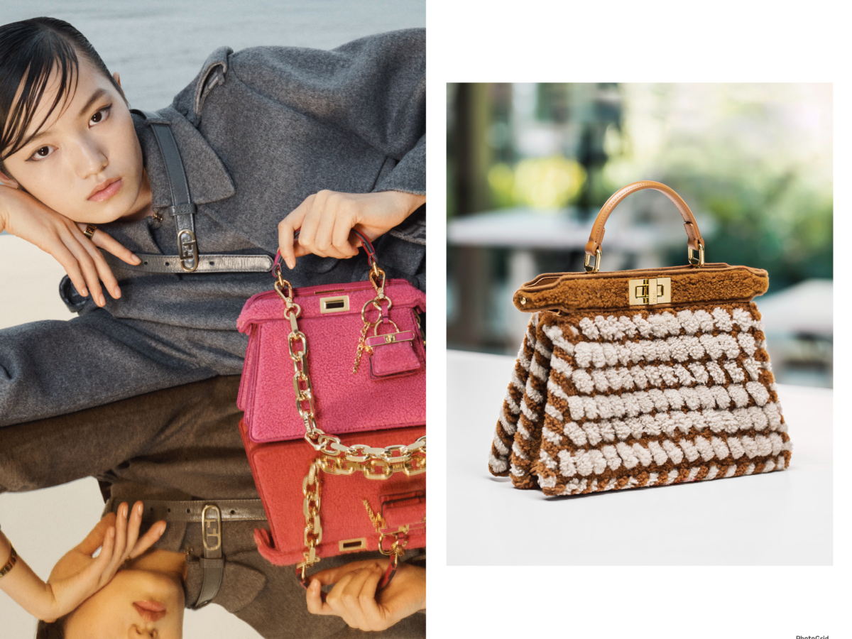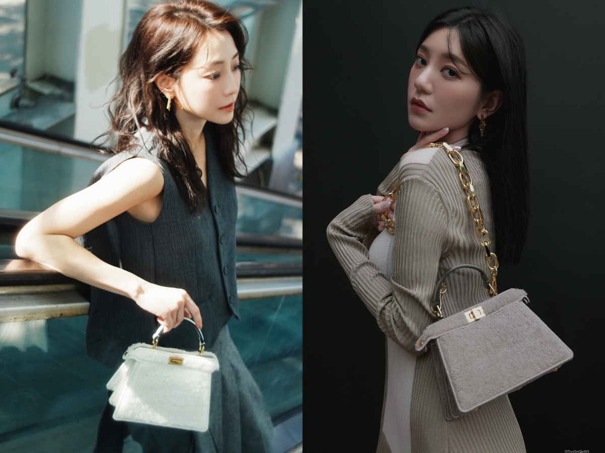Fendi Peekaboo 也有單色調的翻揚毛材質,舒服療癒的白色款和適合秋冬的駝色款,有多種尺寸可選擇,謝欣穎、郭雪芙也分別穿上Fendi 2023秋冬系列演繹此包款,不管是手輕輕拎著或以粗獷鏈條造型肩揹都能打造出不同風格。