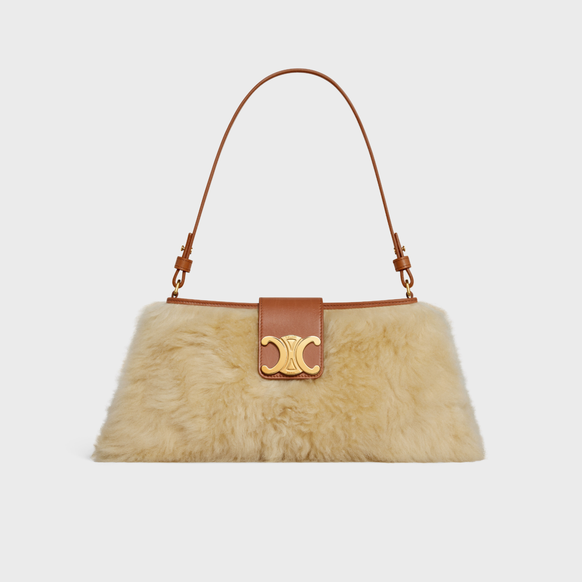 CELINE WILTERN 手袋從原本低調皮製梯形的簡約外觀,換上黃褐色長毛羊皮材質,混搭羊皮襯裡及牛皮革,與開口向中心凹的線條傳遞出極簡美學的視角,皮革翻蓋飾有Triomphe標誌的金屬磁扣,斜背、肩背或手拿都很時髦。