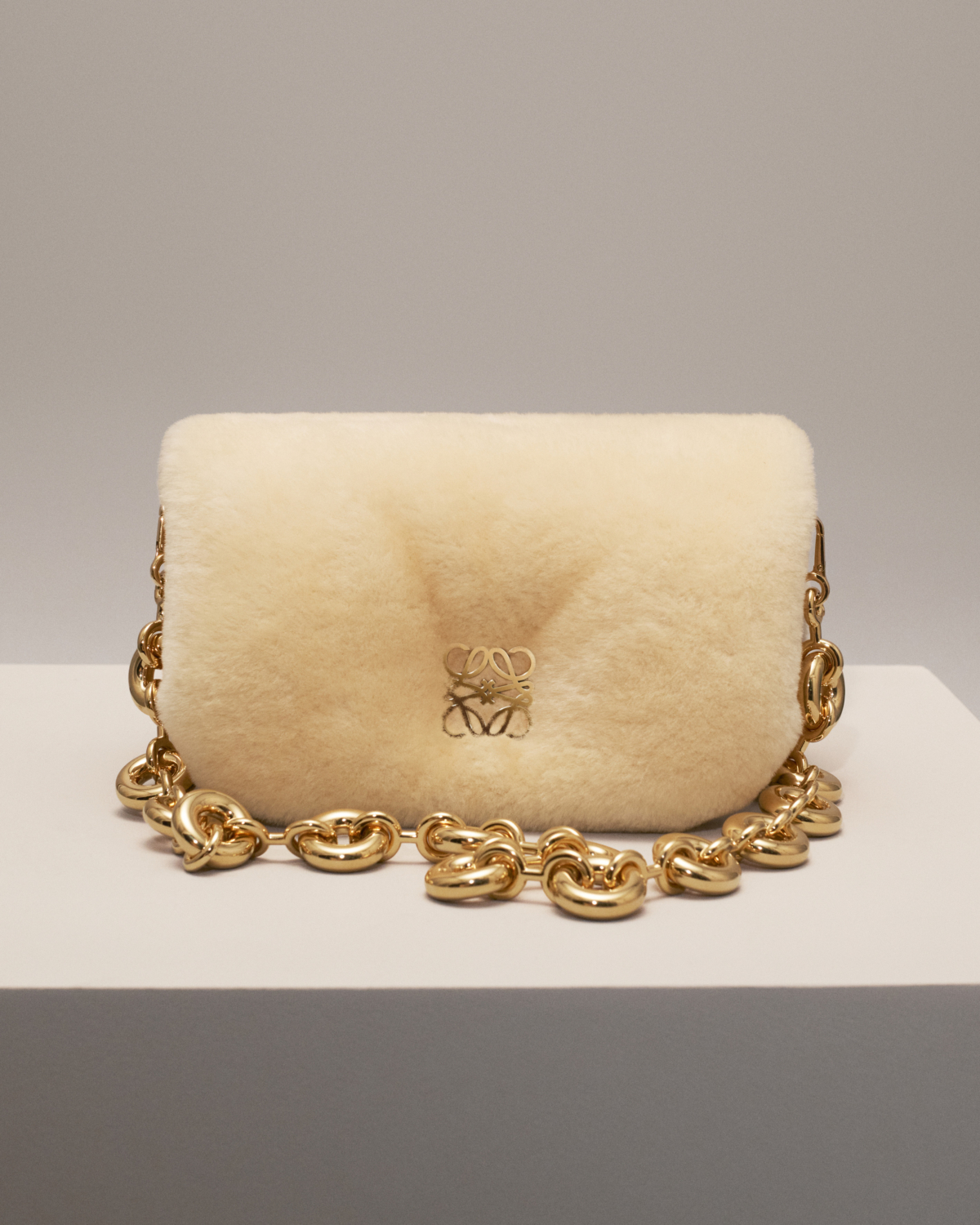 LOEWE Goya 枕頭包也在今年以毛毛姿態登場,採用羊毛質感,從原本的枕頭蓬鬆感變為更舒服的觸感,以甜甜圈金屬背帶為設計,中間飾有品牌標識性,以杏色為主色調,背上身感覺充滿了冬天的氛圍~