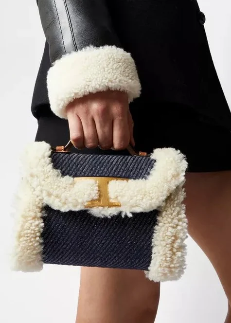 牛仔元素每一年都可以再拿出來一玩再玩!TOD'S T Timeless毛毛拼接圓桶包以牛仔布和綿羊毛製作而成,牛仔布選用斜紋棉質混紡面料,側邊縫製上QQ的綿羊毛,整體有份量感卻不厚重,中間飾有標誌性T字金屬標誌,打造摩登時髦感!