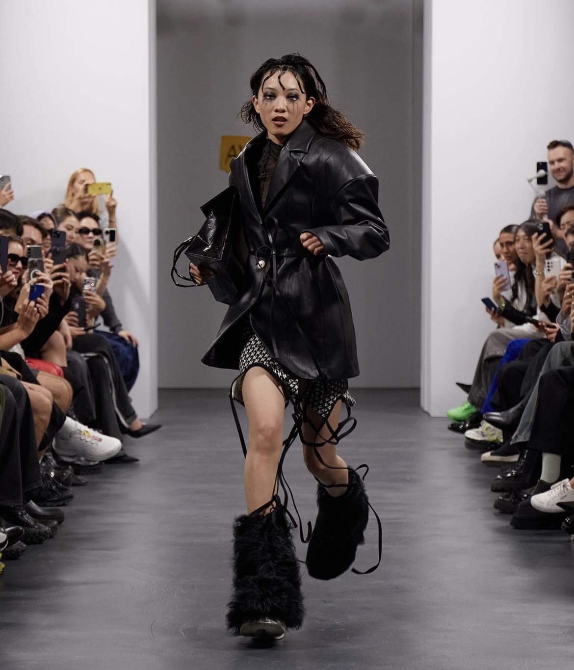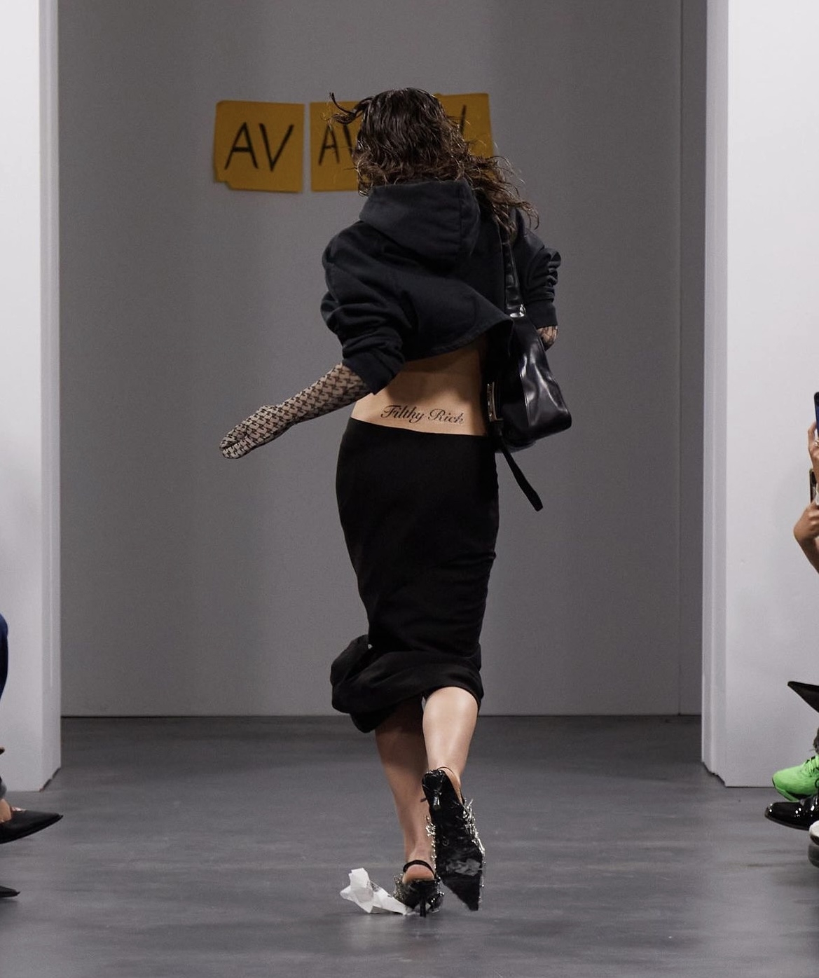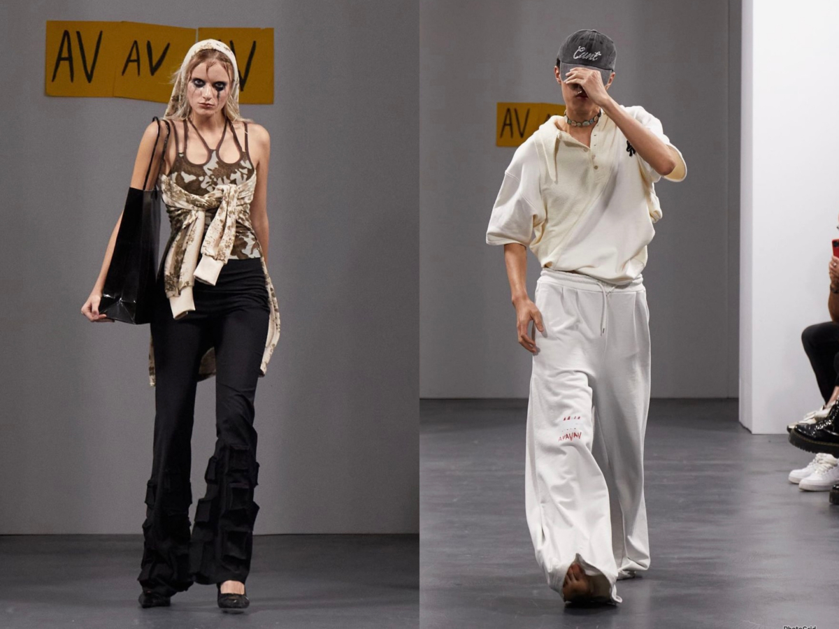 AVAVAV 2024春夏大秀一開場就效果滿滿,即便大秀已正式開始,後台工作人員仍慌亂衝上台把四張寫著「AV」字母便利貼貼到牆上,發現錯誤又匆匆撕掉一張,第一位模特穿著黑色皮衣搭配毛絨鞋狂奔跑上伸展台,頭髮卻亂到不行,緊接著有的邊走邊穿衣服、忘記扣褲子鈕扣、腳下還踩著剛上完廁所的衛生紙、耳環根本沒戴那是便利貼,甚至連衣服都來不及拿就被推上台,連妝容造型都只做到一半,堆到滿出來的時間壓力,這慌亂程度是不是有點像今天早上趕著上班上課的你?