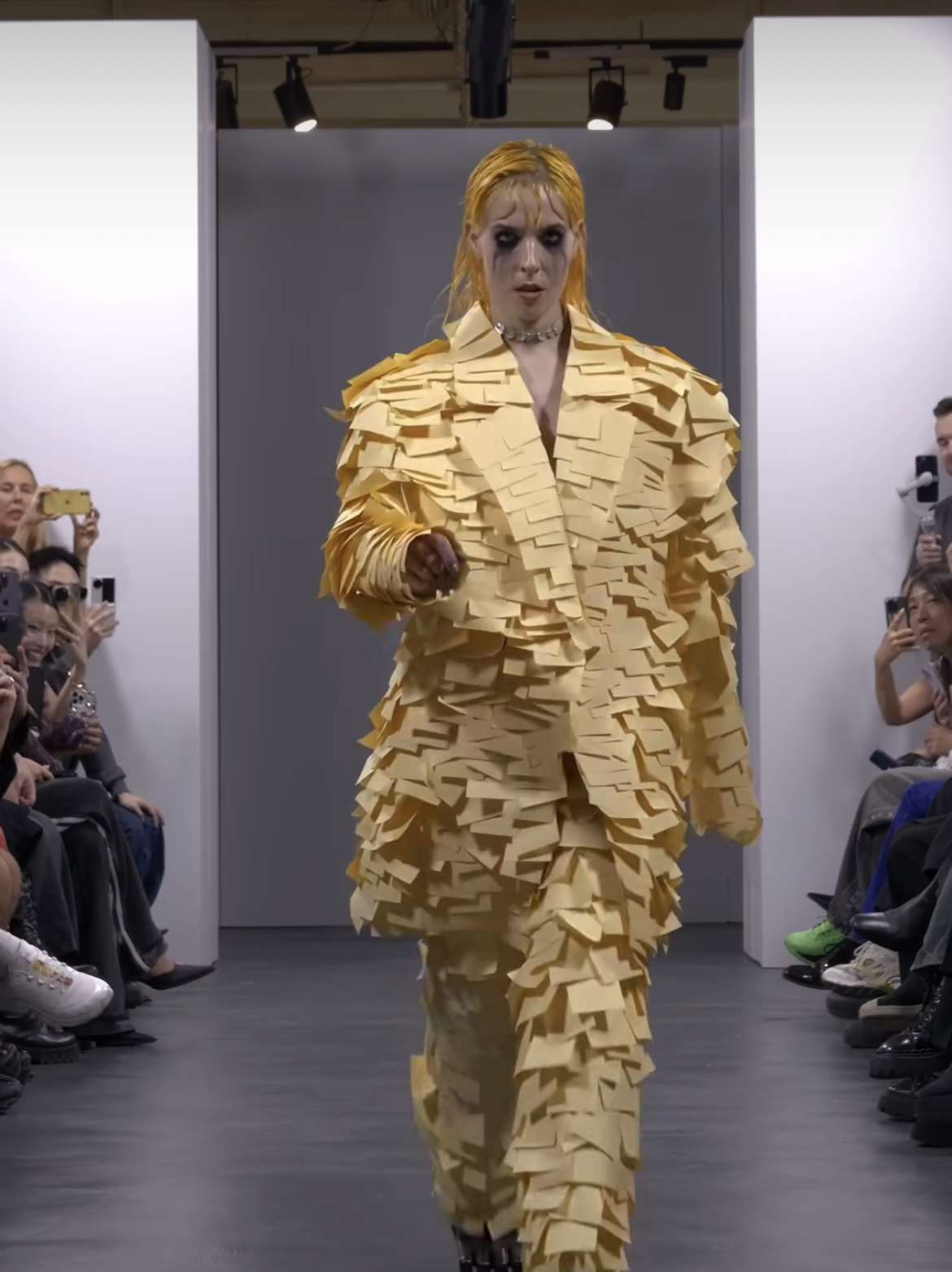 另外還有幾套直接不穿衣服了,呈現根本還沒開始設計的樣貌,隨便用銀色膠布纏繞住全身或胸前,最後壓軸一套寬大西裝套裝竟是由黃色便利貼貼成!即便時尚產業並沒有這麼的過度及浮誇,Beate Karlsson總歸想帶給大眾的只是他獨特選擇不追溯流行、一語道破品牌迷思,並以幽默詼諧的方式,呈現出為了能夠趕上時裝週的時程,品牌和設計師們一季又一季繁複趕工的過程,呈現出一場震撼,讓人產生歸屬感、更貼近日常的時裝大秀。