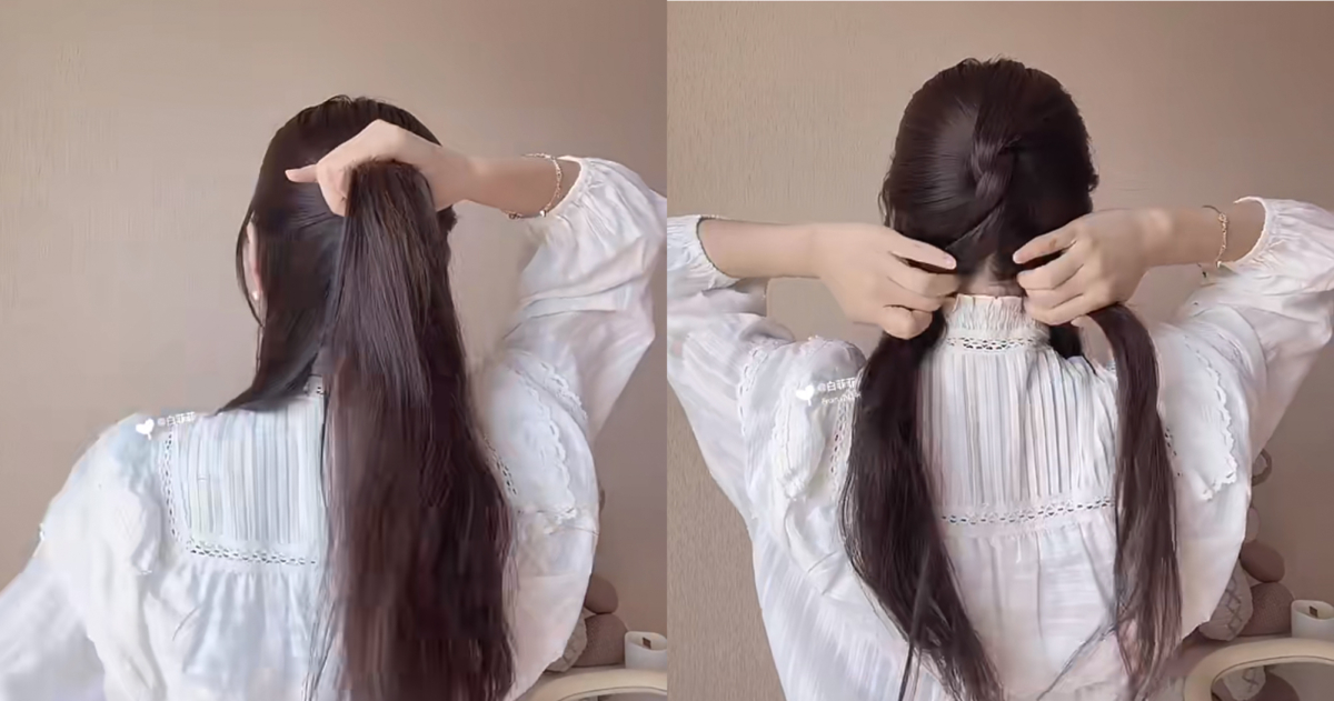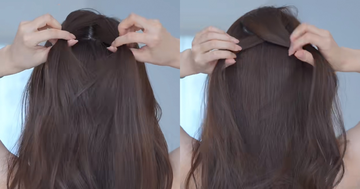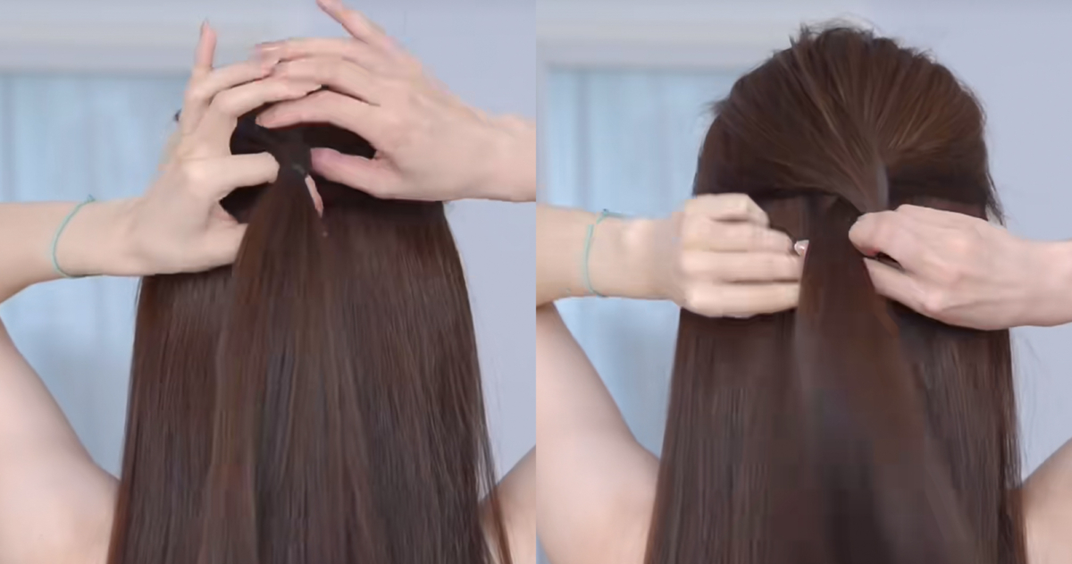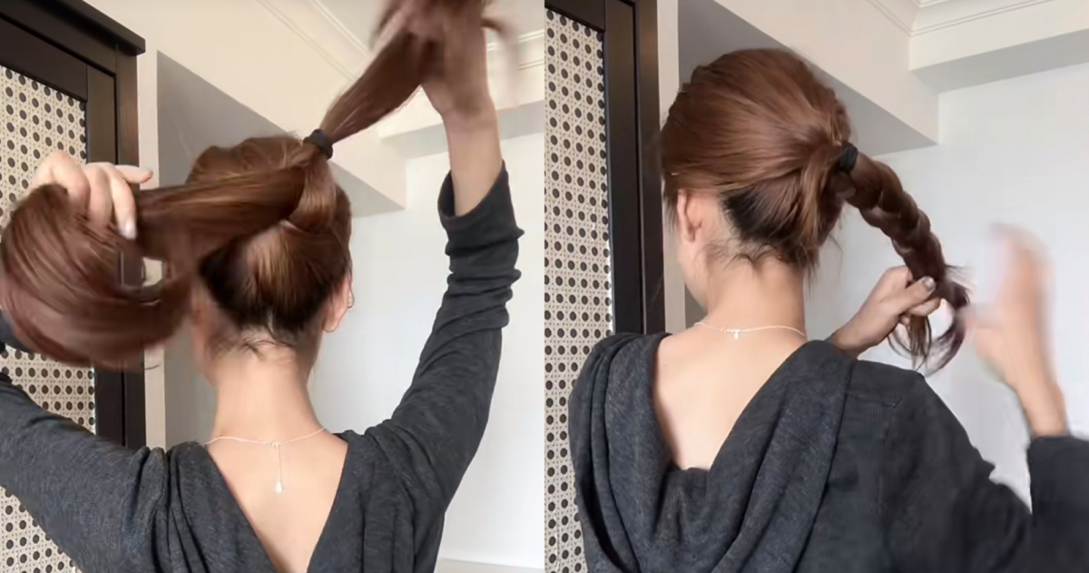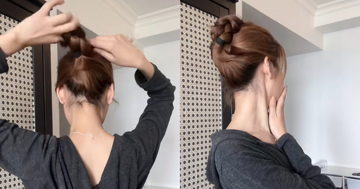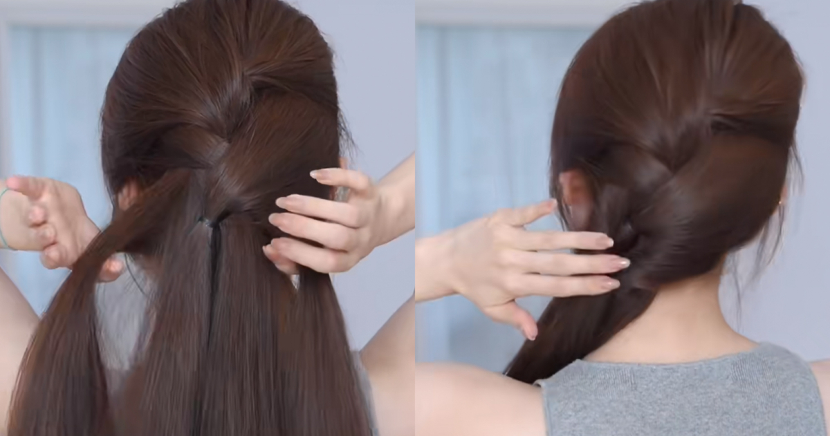 接著手指從中間穿過帶著頭髮擰半圈,形成一個洞後將下方最一開始綁好的頭髮從洞中穿出來,接著重複從兩側各取一縷頭髮用橡皮筋扎起來,並向左轉半圈形成髮洞,在將下方兩股辮子從髮洞穿過去,再從後頸部兩邊頭髮扎起來,中間掏洞從外而內翻轉,這樣就能創造出澎潤的後腦勺,也不容易散開。