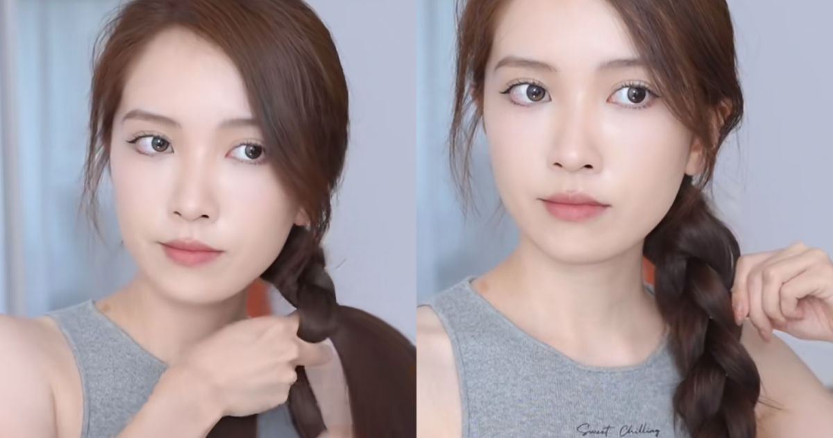 剩下的頭髮放到側邊編成三股辮,結尾處再用橡皮筋固定就完成啦!頭頂及兩側的頭髮和麻花辮可以在微調拉鬆,更顯髮量~