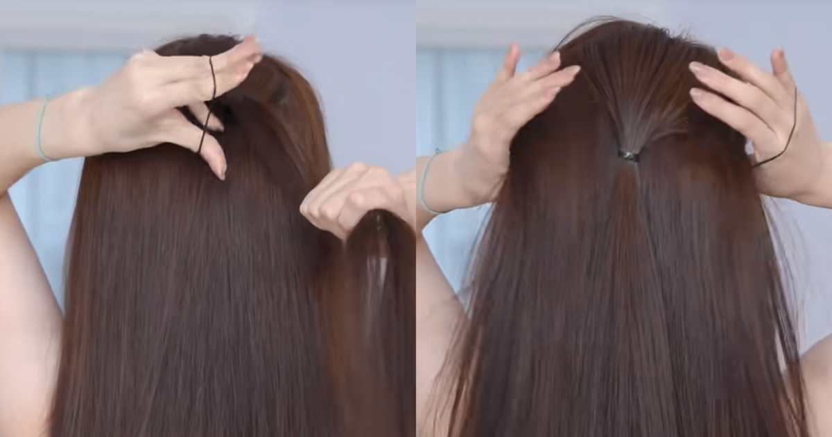 先從耳朵位置分一半頭髮用抓夾往上固定起來,剩餘的頭髮用橡皮筋紮起來,再將橡皮筋往後拉中間處掏一個髮洞,扭一圈手指穿過後將上方的頭髮穿過髮洞拉出,接著再將皮筋束緊,這樣不僅可以打造出自然飽滿的後腦勺,頭髮也不易鬆散開來。
