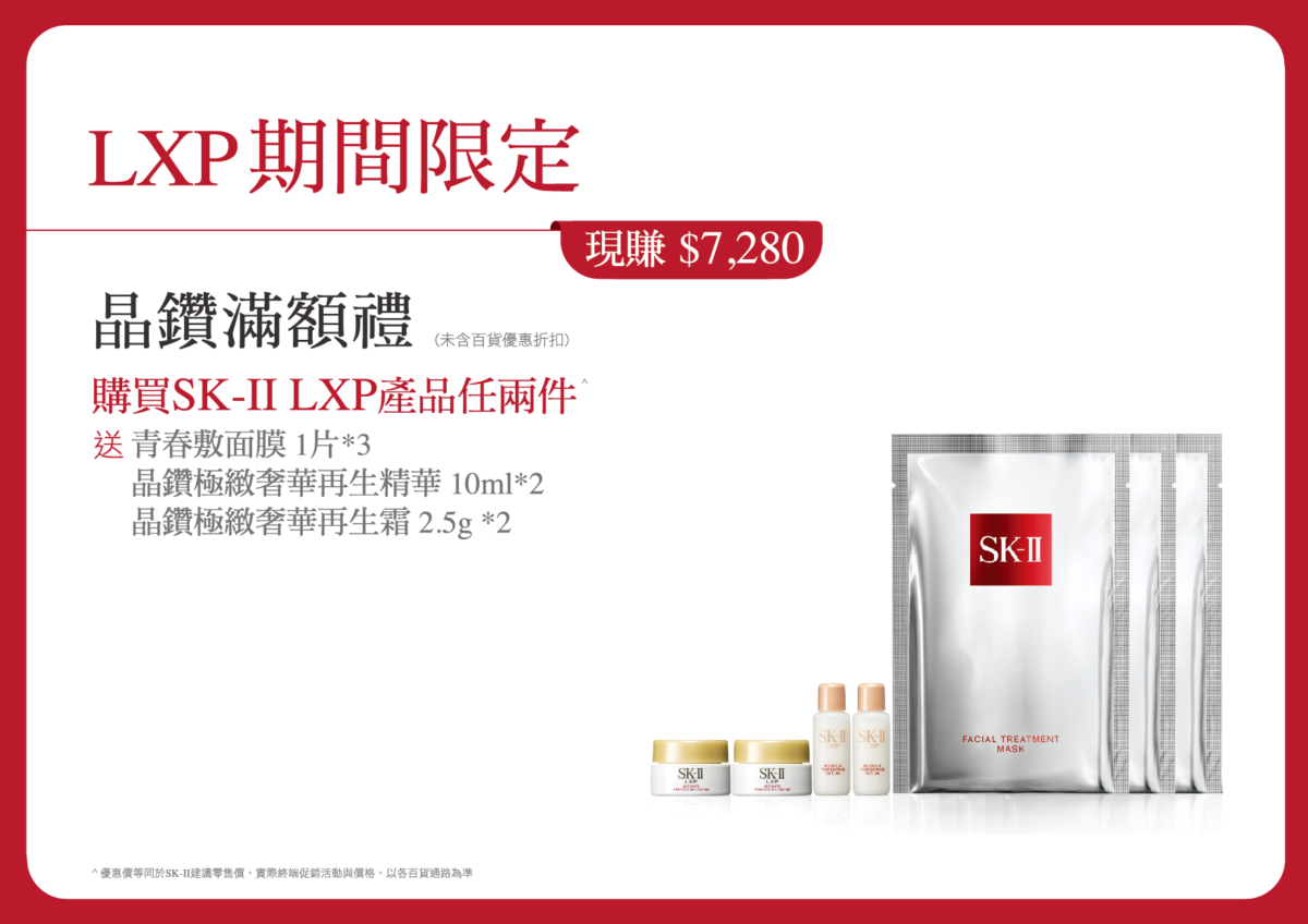 今年週年慶也推出專屬頂級系列的滿額贈,只要在活動期間購買SK-II LXP 晶鑽系列任兩款商品,就能擁有同系列的滿額贈品,以及往推好評的「青春敷面膜3片」,贈品價值就高達$ 7,280!這樣的好康只有現在才有,女孩們絕對不要錯過啊~